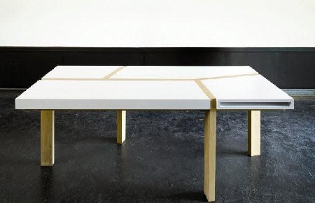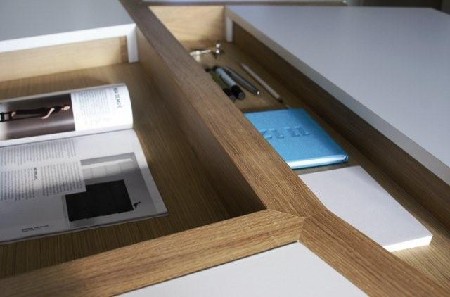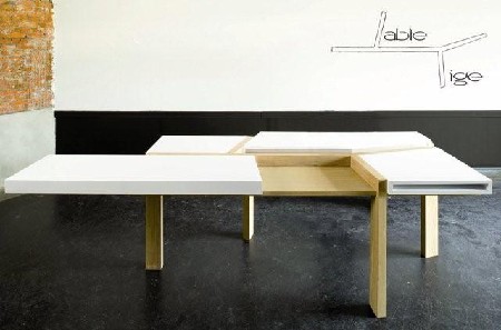Bij de klassieke ladetafel maken de opbergladen slechts oppervlakkig deel uit van het gehele meubel. Door de opbergruimte bovenop het tafelblad te plaatsen, wordt dit geïntegreerd in de totaliteit van het meubel. In gesloten toestand biedt Table Tige rommelvrije werkruimte terwijl in open toestand, wanneer de lades worden open geschoven, het werkoppervlak vergroot wordt zonder het visuele beeld te verstoren.