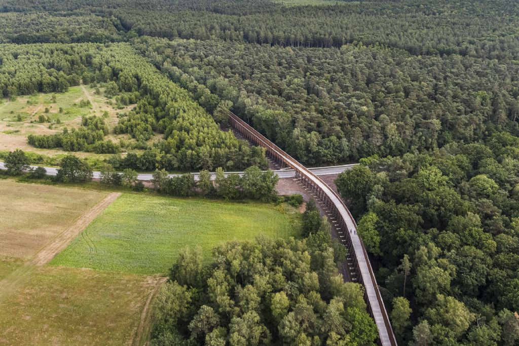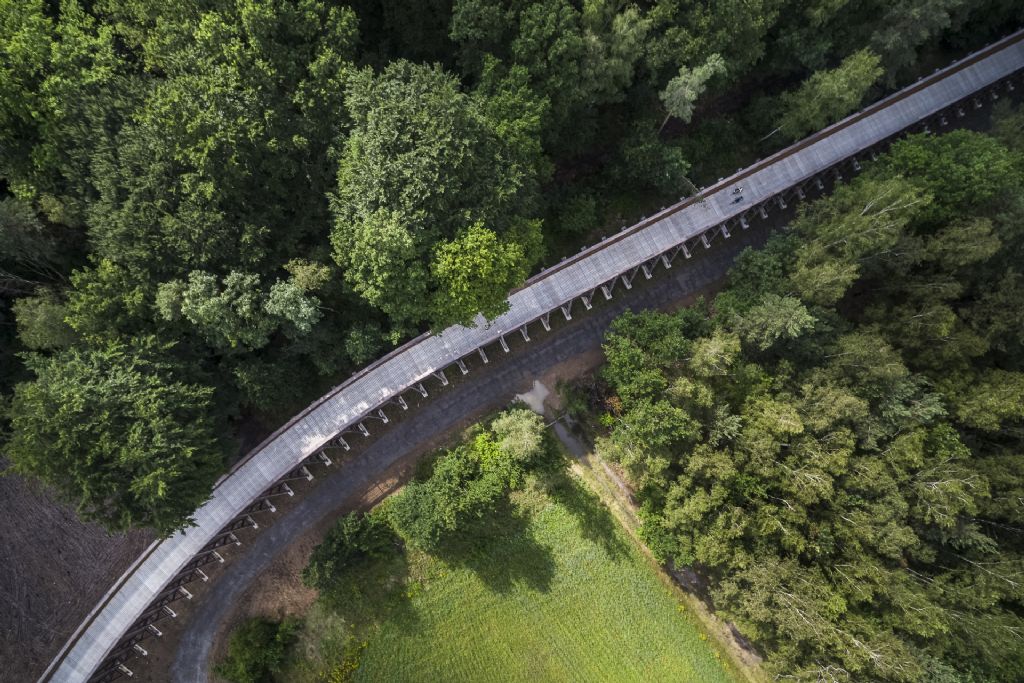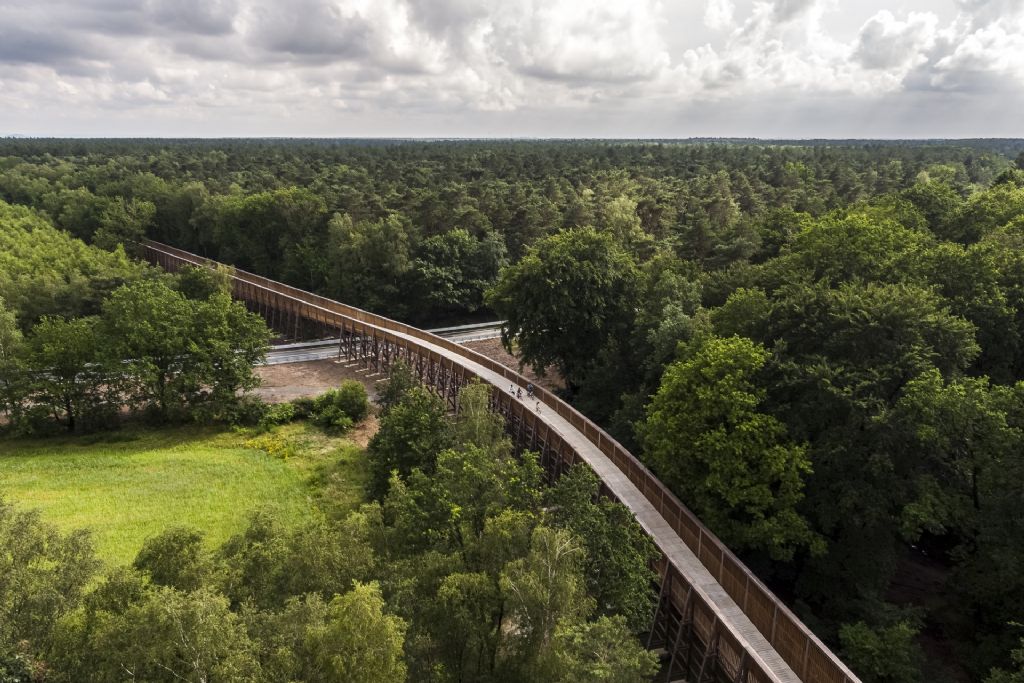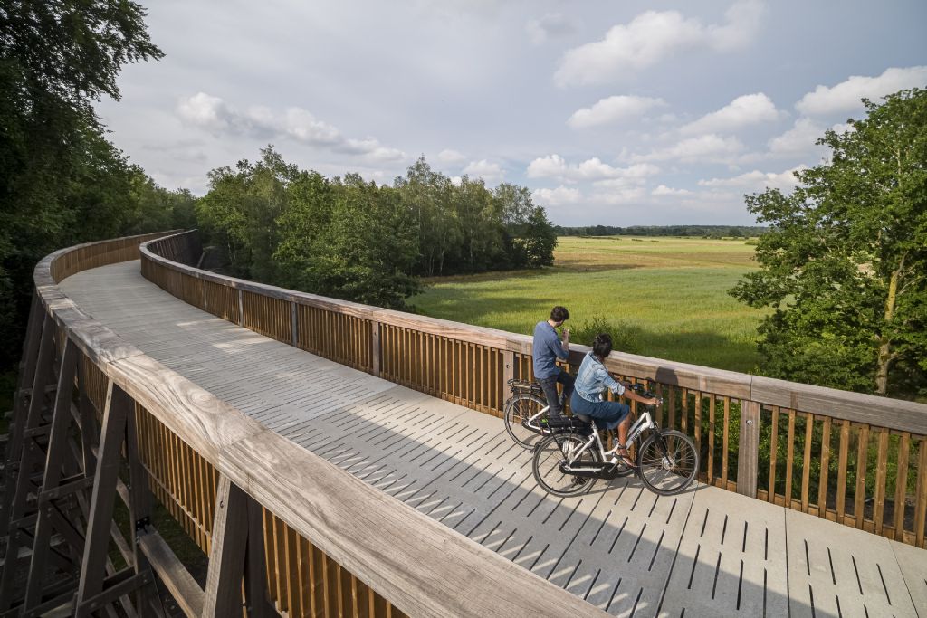 Na ‘Fietsen door het Water’ in Bokrijk en ‘Fietsen door de bomen’ in Bosland, opent Visit Limburg een nieuwe fiets- en wandelbeleving in het Nationaal Park Hoge Kempen. “’Fietsen door de Heide’ is een belevingsroute van vier kilometer waar de nieuwe fietsbrug als baken in het landschap een uitzonderlijk zicht geeft op een buitengewoon stukje natuur”, aldus Igor Philtjens, gedeputeerde en voorzitter van Visit Limburg. Het ontwerp is van de hand van MAAT-ontwerpers; Bart Lens en Witteveen + Bos. Aannemer Besix nam het bouwen van de fietsbeleving voor zijn rekening.
