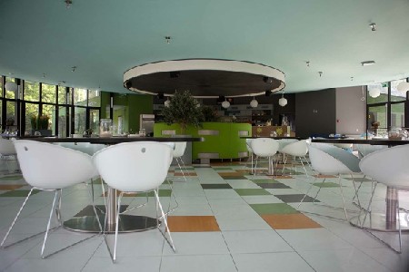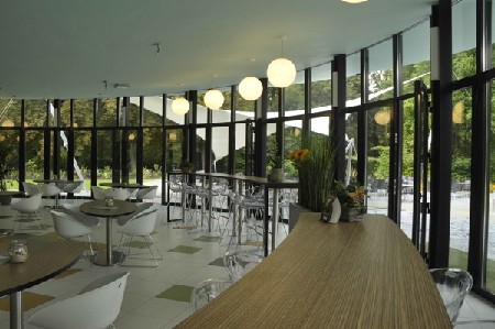 Kennes-Elegeert: "Wij hebben het gebouw eerst gestript tot kolommen en schaaldak, en daarna met veel aandacht terug opgebouwd. Er werd een nieuw groen volume aangebouwd voor de industriële keuken, en een spichtige zeilconstructie toegevoegd om schaduw te bieden op het terras. Deze drie elementen, schaaldak, groene aanbouw en zeil, houden elkaar ruimtelijk in evenwicht".