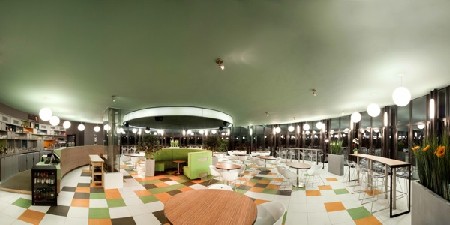"Ook met ons concept voor de inrichting wilden we terug aansluiten op het optimisme van de jaren ’50. We gebruiken laminaten in zebrano, oranje en groene kleuren,... tot de laatste plaatjes op de deuren van de toiletten hebben we ontworpen, om een totaalbeeld te realiseren waarbij we dat frisse gevoel vasthouden. Nooit nostalgie, wel een update van de fifties naar vandaag".
