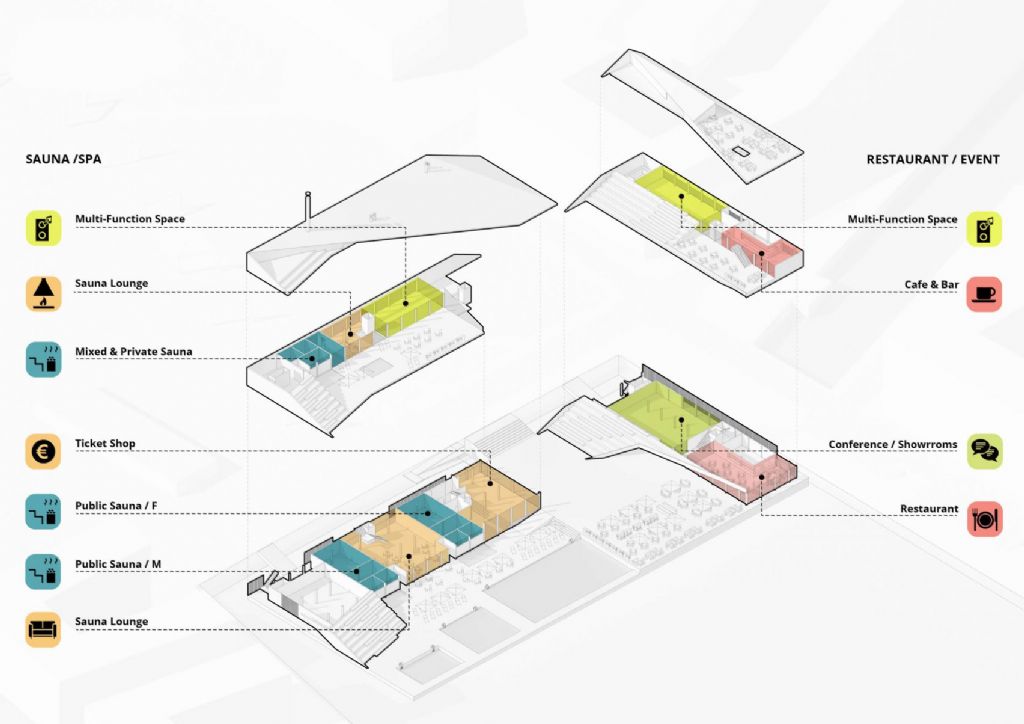 Het winnende ontwerp van OOPEAA werd geprezen omwille van het architecturale karakter en het sterke concept. Een aantal elementen, zoals de zwembaden zelf, zullen drijvende structuren zijn, terwijl andere delen aan land verankerd zullen worden. “Het doel is om een familie van drijvende zwembaden te bouwen in kuststeden over heel de wereld”, vertelt Anssi Lassila, oprichtster van OOPEAA. “Even ontspannen na een hectische dag is een van de basisprincipes in de Finse saunacultuur.”