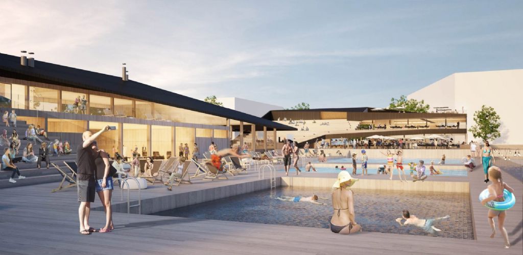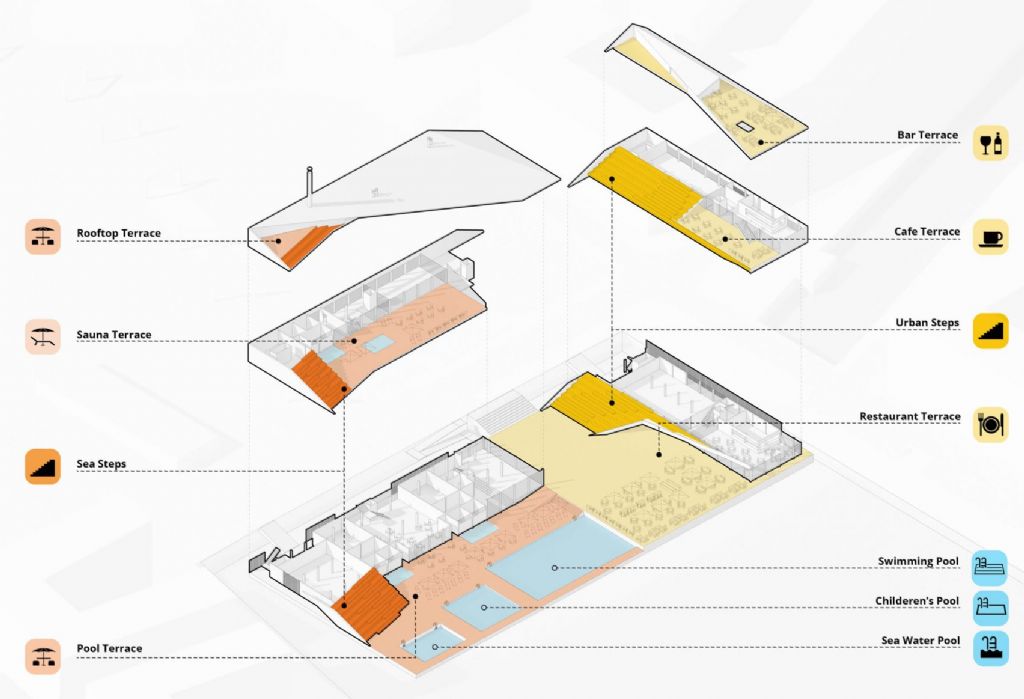 Beide kanten zijn voorzien van een grote brede trap waarop mensen kunnen samentroepen en een mooi zicht hebben op wat zich allemaal op de site afspeelt. De verschillende zones worden door open ruimtes met elkaar verbonden. De sauna’s liggen op hun beurt op hoogte zodat bezoekers nog beter kunnen genieten van het zicht op de zee, zonder aan privacy in te boeten.
