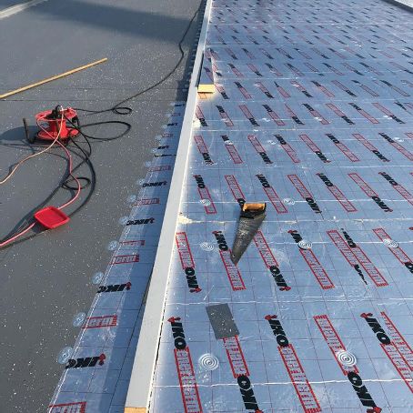 De dakrenovatie vroeg om een grondige aanpak. De oude dakpannen werden verwijderd en alles tot en mét de vochtige OSB-platen werd volledig gesloopt. Op de nieuwe houten onderconstructie kwam een zelfklevend aluminium dampscherm en extra isolatie onder de vorm van 70 mm dikke alu-gecacheerde PIR-isolatieplaten. Voor de uiteindelijke dakbedekking werd geopteerd voor een 1,5 mm dikke polyester versterkte RENOLIT ALKORPLAN F Colour, een middengrijze dakbaan die mechanisch bevestigd wordt. Door de flexibiliteit van dit dakmembraan vormt de ronde vorm van het gebouw geen enkel probleem. Meer nog, het materiaal zorgt zelfs voor een nog moderner resultaat.