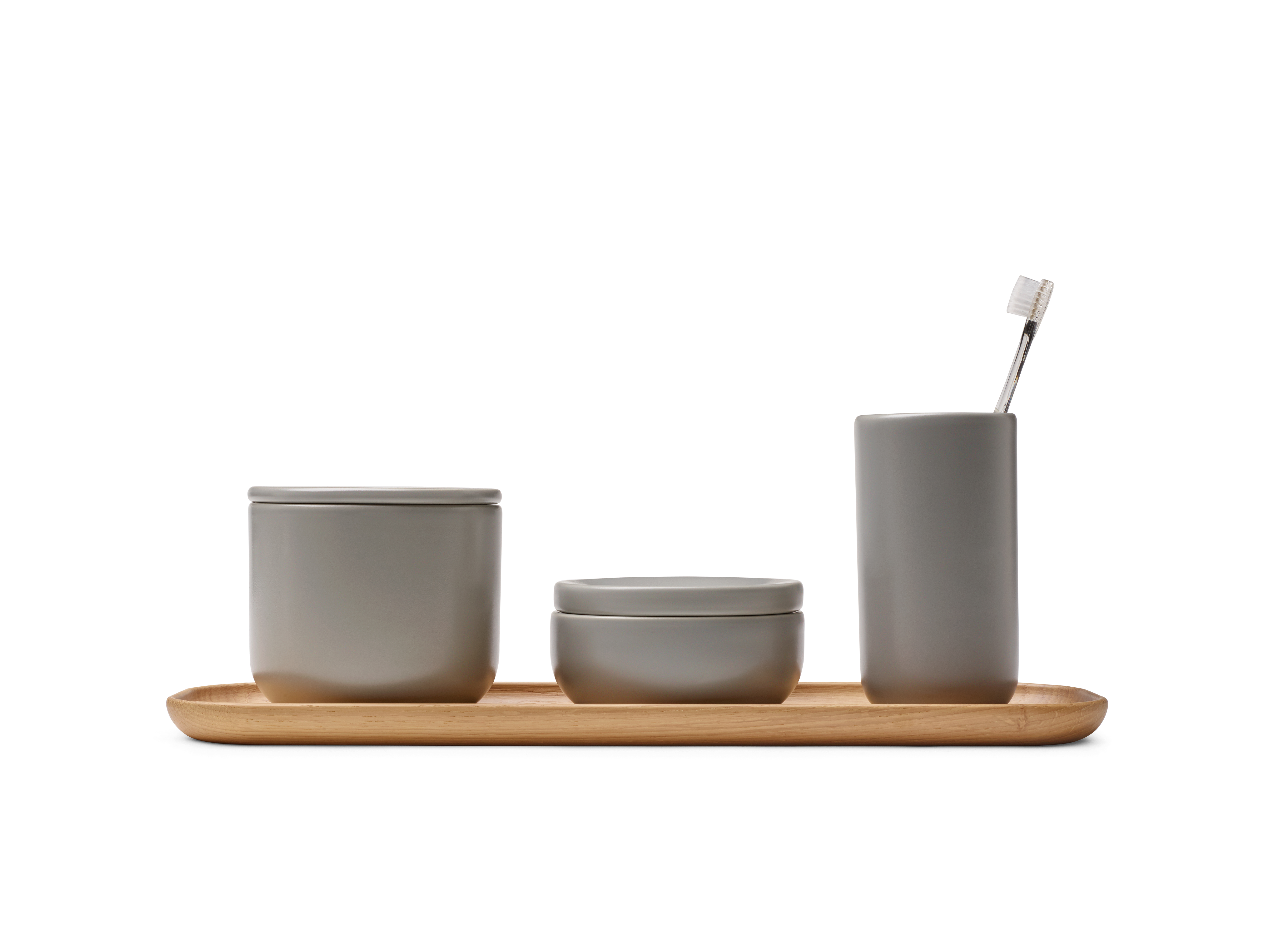 - Vincent van Duysen voor When Objects Work – badkamerset (eiken dienblad 53 euro, dienblad in grijze keramiek 37,50 euro, houder in grijze keramiek 10 cm - 33 euro, houder in grijze keramiek 5 cm - 31 euro, beker in grijze keramiek 14 euro)