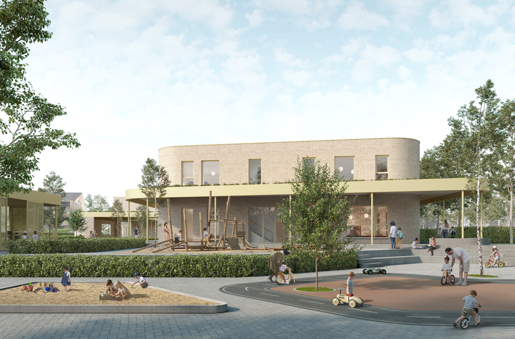 De speelomgeving is gevarieerd en meerlagig. Kleuters beschikken over eigen tuintjes met een directe link naar de klaslokalen en een overdekte speelplaats die verschillende toegangen met elkaar verbindt. Voor de lagere school liggen rustige plekken rond een luifel, terwijl een buitentrap leidt naar een actieve speelzone op het dak van de refter, waar meerdere sportvelden worden voorzien. Het glooiende terrein versterkt die ruimtelijke ervaring en introduceert subtiele hoogteverschillen in het spel.