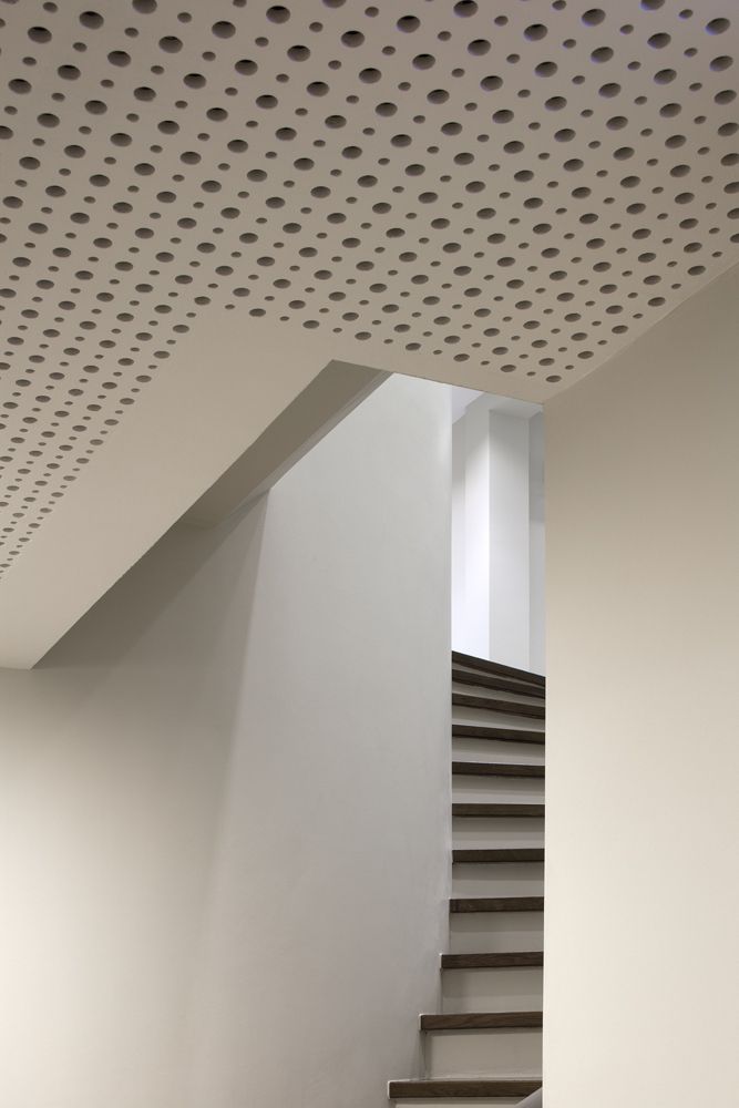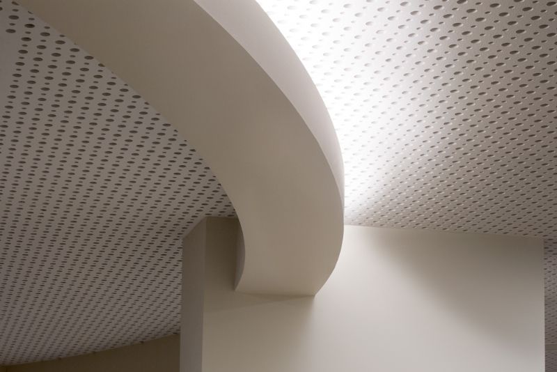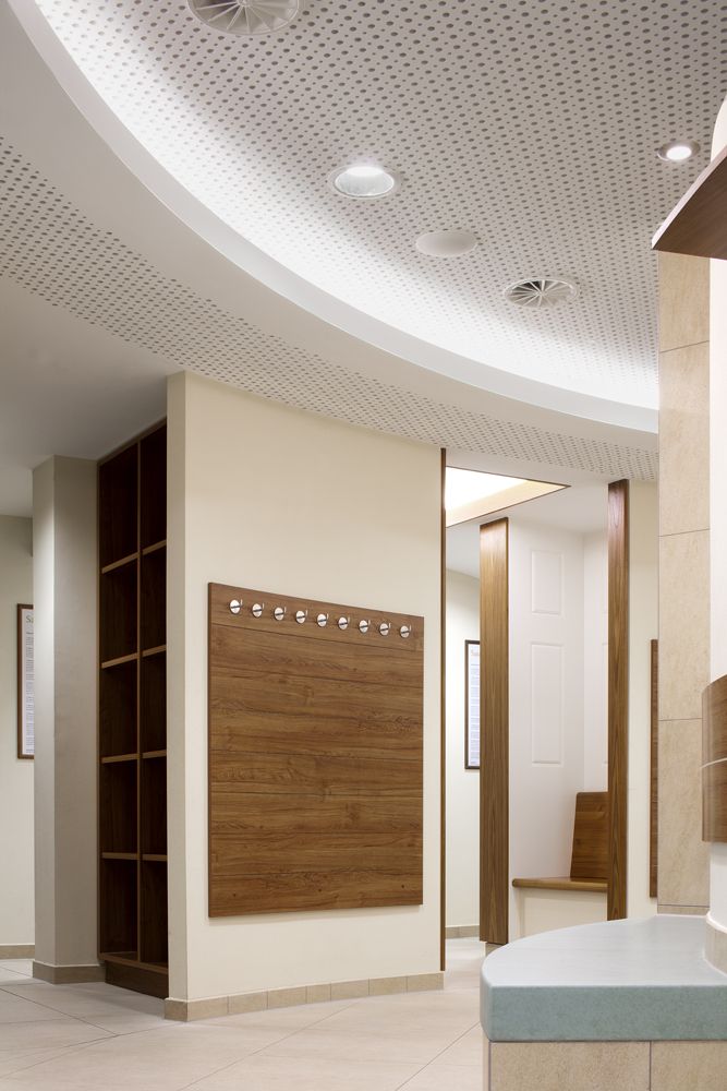 De ruimtelijke akoestiek moest grondig worden aangepakt. De communicatiekwaliteit moest duurzaam worden verbeterd, zowel in de communicatieve ruimtes (zoals de receptie) als in de geluidsintensieve zones. Nu zorgt een akoestisch geperforeerde designconstructie voor een aangename sfeer. De platen zijn verkrijgbaar in klassieke uitvoering als geperforeerde gipsplaat (LaCoustic), maar ook als vochtbestendige plaat (LaCoustic WAB).