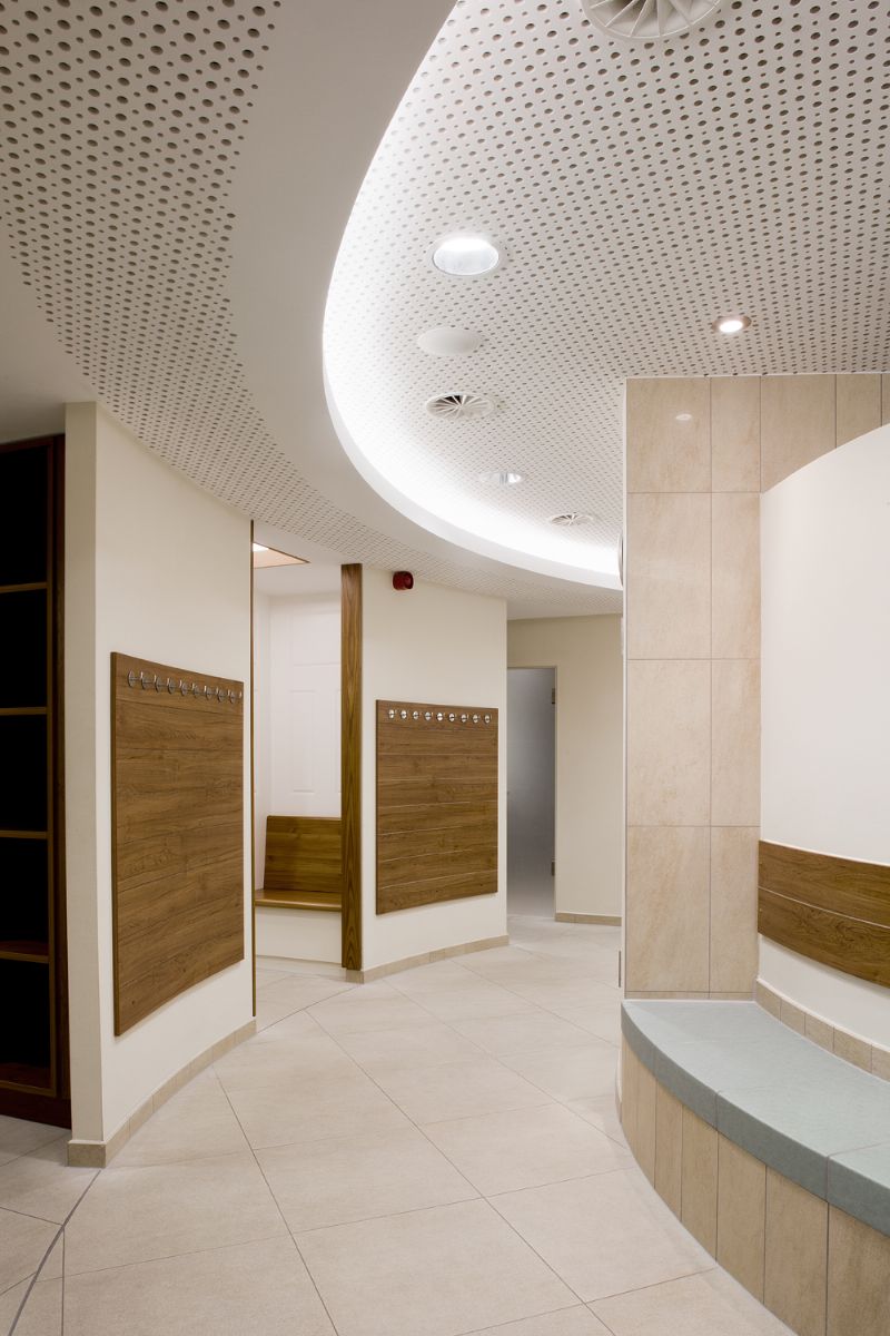 In het typisch Oost-Friese spa- en wellnesscenter Badewerk in Neuharlingersiel moest de communicatiekwaliteit duurzaam worden verbeterd, zowel in de communicatieve ruimtes (zoals de receptie) als in de geluidsintensieve zones. Het plafond met akoestisch geperforeerde LaCoustic WAB-platen van Siniat zorgt voor een aangename sfeer.