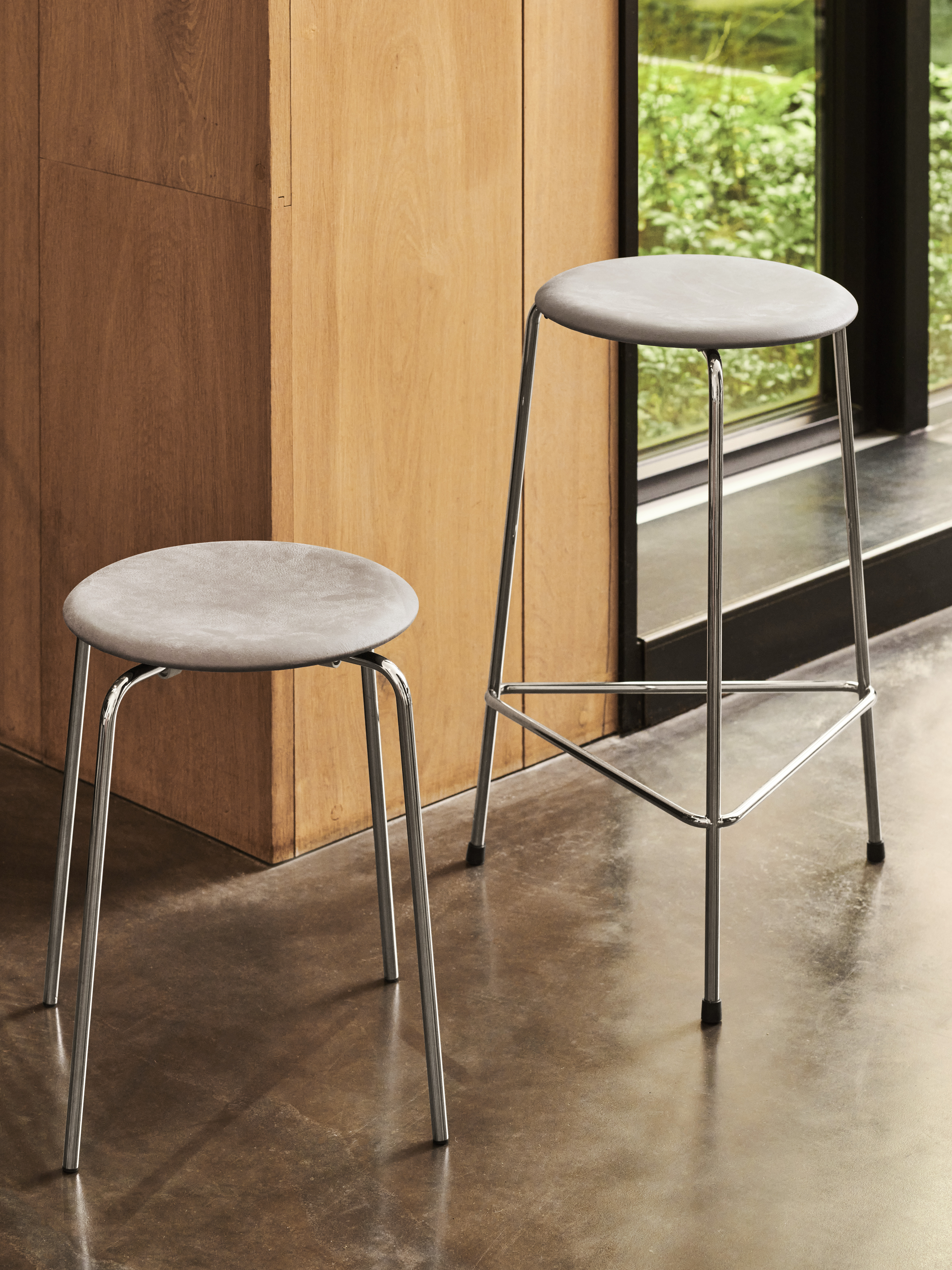 Fritz Hansen lanceert eveneens een nieuwe variant van één van de klassiekers, de barkrukken DotTM en High DotTM van Arne Jacobsen in geschuurd leder. Het zitvlak van de barkrukken voelt zacht aan en werd geschuurd. Het geschuurde leder vormt een prachtige combinatie met de chromen poten, die meer karakter en patina krijgen doorheen de tijd. De neutrale kleuren zijn een mooie aanvulling op warme en koele kleurenschema’s, waardoor de krukken een hedendaagse toets bieden aan alle ruimtes.