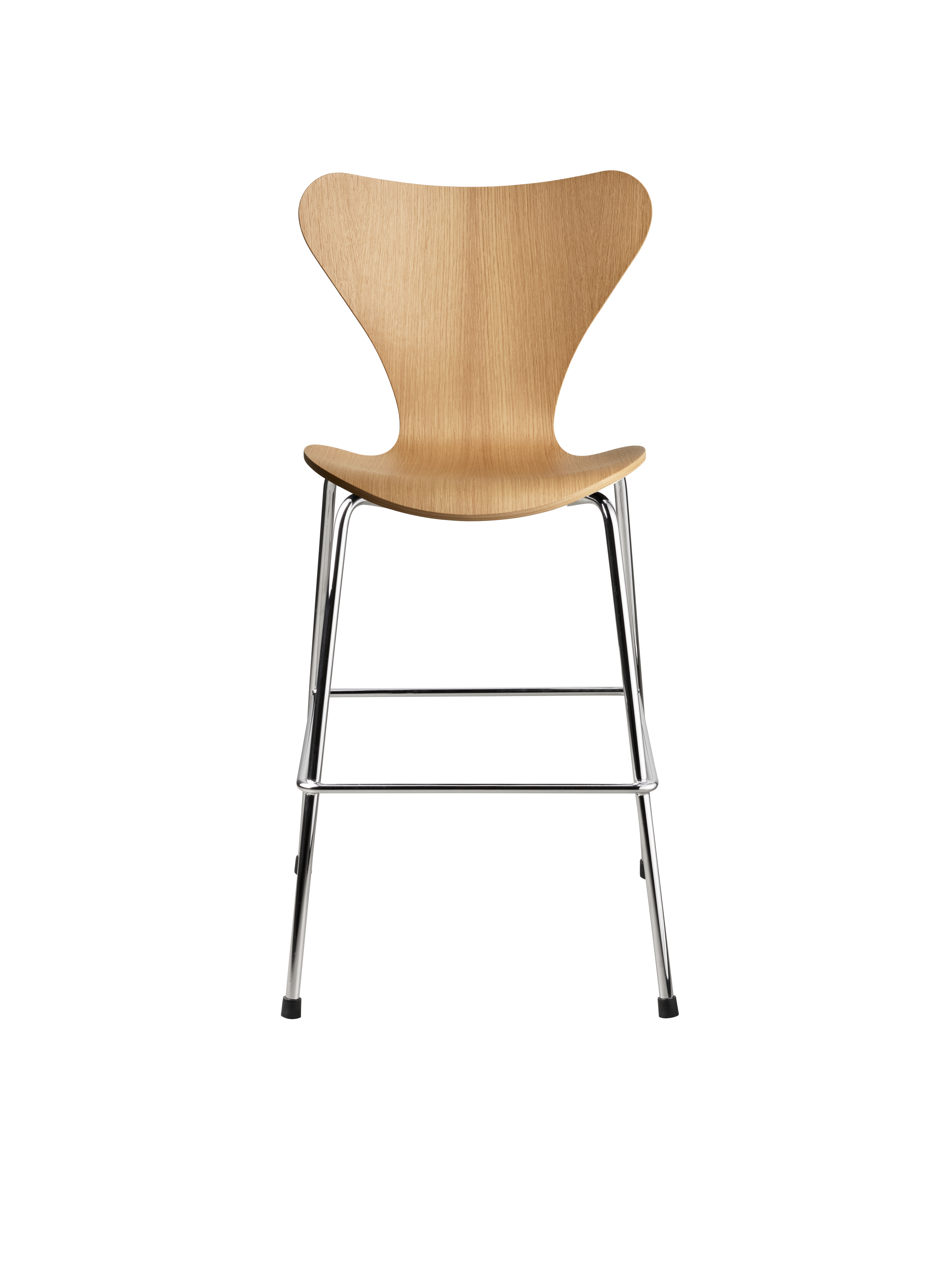 “We kozen voor eik omwille van zijn warme kleur en sterke doch neutrale look. Eikenhout wordt mooi oud en gaat perfect samen met een uitgebreid gamma materialen en kleuren van tafelbladen”, zegt Christian Andresen, Head of Design bij Fritz Hansen. Net als de stoel in eikenhout, wordt de Series 7TM Junior ook gelanceerd in zwart essenhoutfineer met chromen poten. De schelp is gemaakt van onder druk gevormd fineer, terwijl het binnenste fineer is gemaakt van beukenhout met het Forest Stewardship Councel-certificaat (FSC).