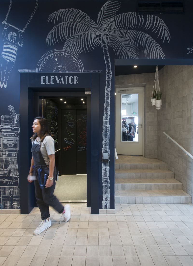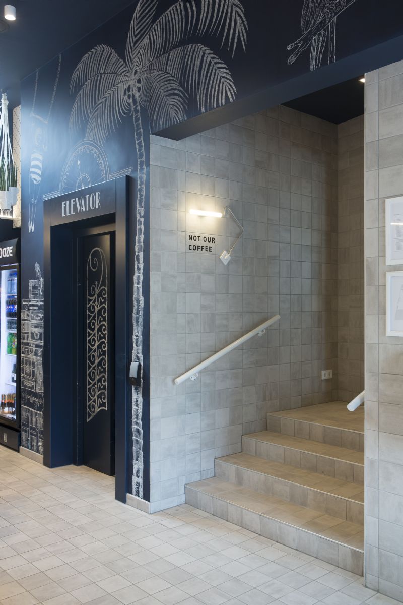 De creatieve interieurarchitect heeft van Kaboom een hotel gemaakt zonder fratsen en met de meest uiteenlopende functionaliteiten. Zo is er in hotels sprake van veel schade, met name in de gangzones. Dat komt onder andere door al de koffers die door de gangen worden meegetrokken en de grote linnenkarren die erop voortgeduwd worden. Er is daarom nagedacht over een lambrisering van diagonale keramische tegels op de gangen die dient als bescherming voor de wanden. Tegelijk ziet dit er ongelooflijk uniek uit. De lambrisering is gemaakt met vloertegels van de Mosa Scenes.