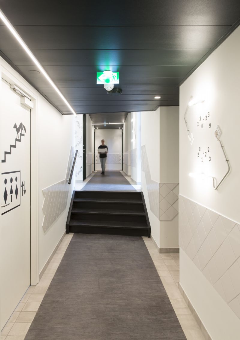 In het midden van de gangpaden ligt een stoffen loper met aan de weerszijden tegels. Die tegels liggen daar met de reden dat als iemand met zijn rolkoffer over de gang loopt en de koffer naast het tapijt komt, dat meteen doorheeft en zijn koffer terugtrekt naar het midden, omdat er een wieltje over de tegels ratelt. Hiermee is een veelvoorkomende schadeoorzaak voor de gangwanden stijlvol opgelost. Deze vloertegels in de gang zijn ook van de Mosa Scenes. Deze ongeglazuurde topkwaliteit vloertegels zijn niet kapot te krijgen, dubbelhard gebakken, krasvast en ook nog eens duurzaam geproduceerd in de fabriek in Maastricht. En daarom helemaal hufterproof en dat is precies waar Rino naar zocht voor Kaboom.