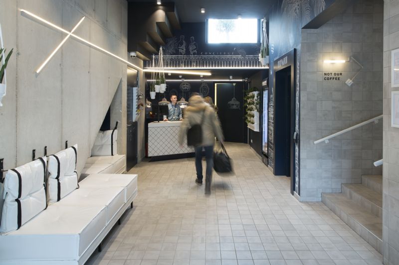 Interieurarchitect Roger Haan werd gevraagd een onderscheidend hotelconcept te bedenken. Hij moest iets met de oorsprong van het bestaande gebouw doen, de omgeving naar binnen halen, gebruik maken van de dynamiek van de omgeving, iets creëren met meerpersoonskamers en een product vormen dat schaalbaar is. Als een product dat uit te rollen valt en in meerdere steden toegepast kan worden. Dat was een behoorlijk palet aan eisen. Maar er was ook een absolute must voor Roger Haan, en dat was werken met Mosa-tegels.