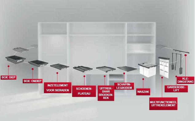 Al tientallen jaren werkt Häfele aan een geoptimaliseerde kastoplossing. Dankzij één concept kan je aan verschillende eisen voldoen: maximale variabiliteit, een consistente en duidelijke designtaal, functionele ideeën die het leven gemakkelijker maken. En dat alles zo comfortabel en eenvoudig mogelijk. Zodat iedereen zijn persoonlijk kastsysteem snel en intuïtief kan vorm geven.