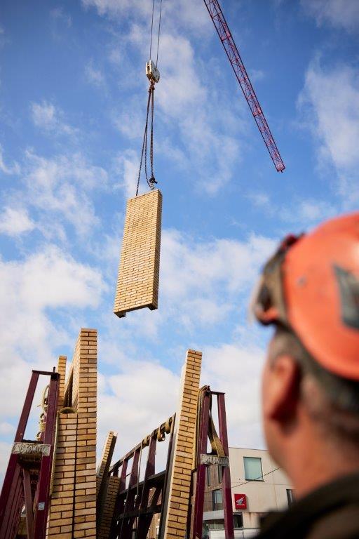 Chris Hallemeersch: “Enerzijds omdat we nog maar moeilijk goede stielmannen vinden die voldoende rendement halen bij het metsen, anderzijds omdat het ons in staat stelt om het uitvoeringsproces veel beter onder controle te houden. We zijn niet afhankelijk van weersinvloeden en kunnen bijgevolg just in time leveren op de werf, waar de bouwtijd aanzienlijk korter is. Kortom: alles is voorspelbaarder en de risicofactor is veel kleiner. Bovendien vaart ook de kwaliteit er wel bij, kunnen we er makkelijk complexe metselwerkverbanden mee realiseren en leidt het tot minder bouwafval. De keuze om zelf prefab gevelsteenelementen te vervaardigen is dan ook een schot in de roos. Aanvankelijk produceerden we enkel voor eigen projecten, maar intussen verkopen we ook aan externen, zoals voor de realisatie van O’Sea 3 in Oostende. We weten dus wat gedaan (lacht).”