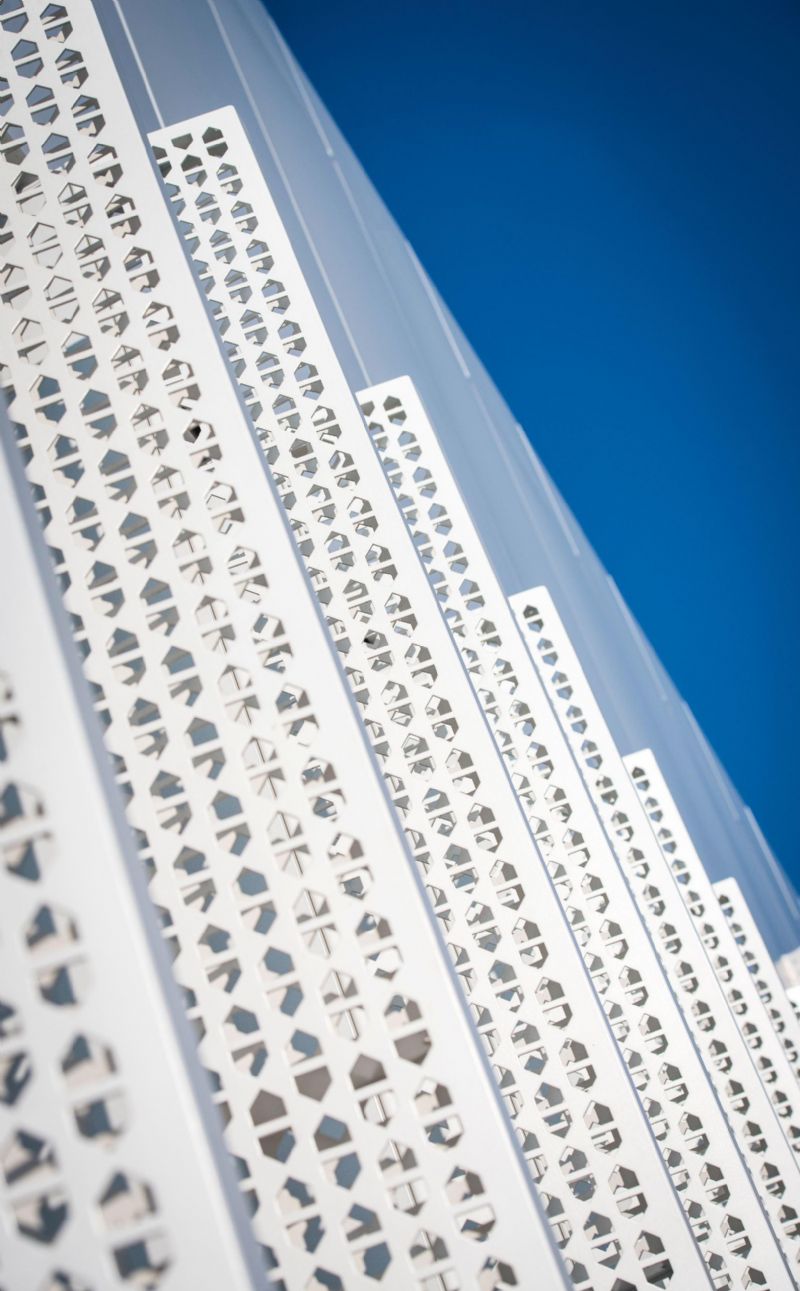 Het archetypische gebouw mag er dan wel eenvoudig uitzien, maar vanaf het gieten van de eerste betonnen kolom, moest de bouwploeg rekening houden met de finale uitlijning. Dit was volgens Tack dan ook één van de grootste uitdagingen bij dit project: “Als je zo’n project wilt neerzetten, moet je vanaf dag één al weten wat het eindresultaat zal zijn. Gelukkig heeft Limeparts ons bij elke stap in het ontwerp- en bouwproces erg goed kunnen ondersteunen, zo ook bijvoorbeeld bij het zoeken naar oplossingen voor de isolatie tussen de muren en de gevelcassettes.” Zelfs de kleinste details, zoals de perforaties van de zonneweringen in huisjesmotief, voldoen aan de persoonlijke specificaties van de architecten. De gevelcassettes geven het gebouw daardoor een erg unieke toets, of men er nu een monopoliehuisje, een eigentijds benaderde fermette of een binnenstebuiten gedraaid kledingstuk in ziet.