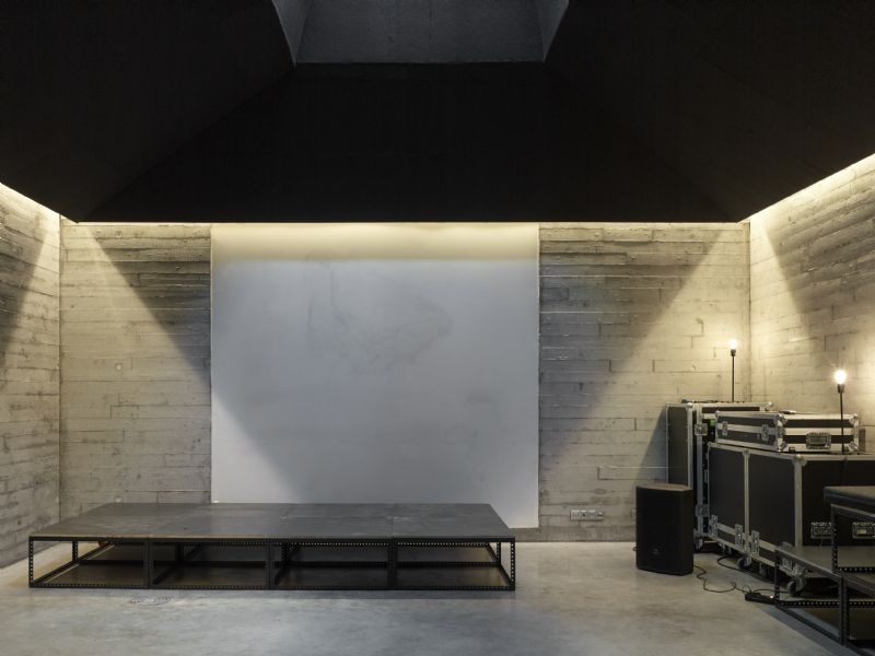 De integratie van de polyvalente (fuif)zaal in het hart van het gebouw vroeg ook om de juiste architecturale ingrepen. De zaal werd ontworpen als een volledig ontkoppeld betonnen volume, rustend op trillingsdempende blokken. Het plaatsen van dubbele ramen met een extra luik had eveneens akoestische redenen.
