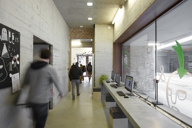 De gevels van de nieuwbouw aan de Kleine Kauwenberg zijn in plankenbeton. Deze gevels werden ter plaatste gestort en zijn via thermische ontkoppelingen opgehangen aan de achterliggende draagstructuur. Ook in het interieur van de polyvalente zaal en het studentenloket is dit plankenbeton terug te vinden in wanden, kolommen en plafond.