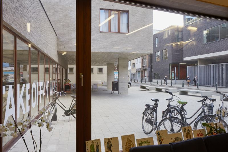 BOB361 architecten koos ervoor om lucht en licht te brengen in het smalle straatje waar het woonhuis zich bevindt door één van de hoofdvolumes dwars te draaien in plaats van op de rooilijn. De oorspronkelijke zijgevel van het huis werd de hoofdtoegangsgevel en een overkraging zorgt voor een uitbreiding van de verblijfsmogelijkheden. Er werd een square gecreëerd die de donkere steeg transformeert tot een aangename verblijfsplek op maat van studenten en bewoners.