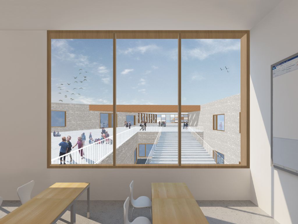 Door koppelingen tussen specifieke voorzieningen en ruimtes wordt ingespeeld op een veelheid aan gebruiksscenario’s. Bestaande niveauverschillen van het terrein worden ingezet om het programma binnen een compact geheel te organiseren. De ruimte boven de deels verzonken fuifzaal wordt mee ingezet als speelplaats van de school. De beschikbare ruimte op maaiveldniveau kan maximaal ingezet worden om het opgelegde publieke programma binnen de terreinoppervlakte te organiseren. De opbouw van het geheel streeft compactheid, polyvalentie en synergie na.