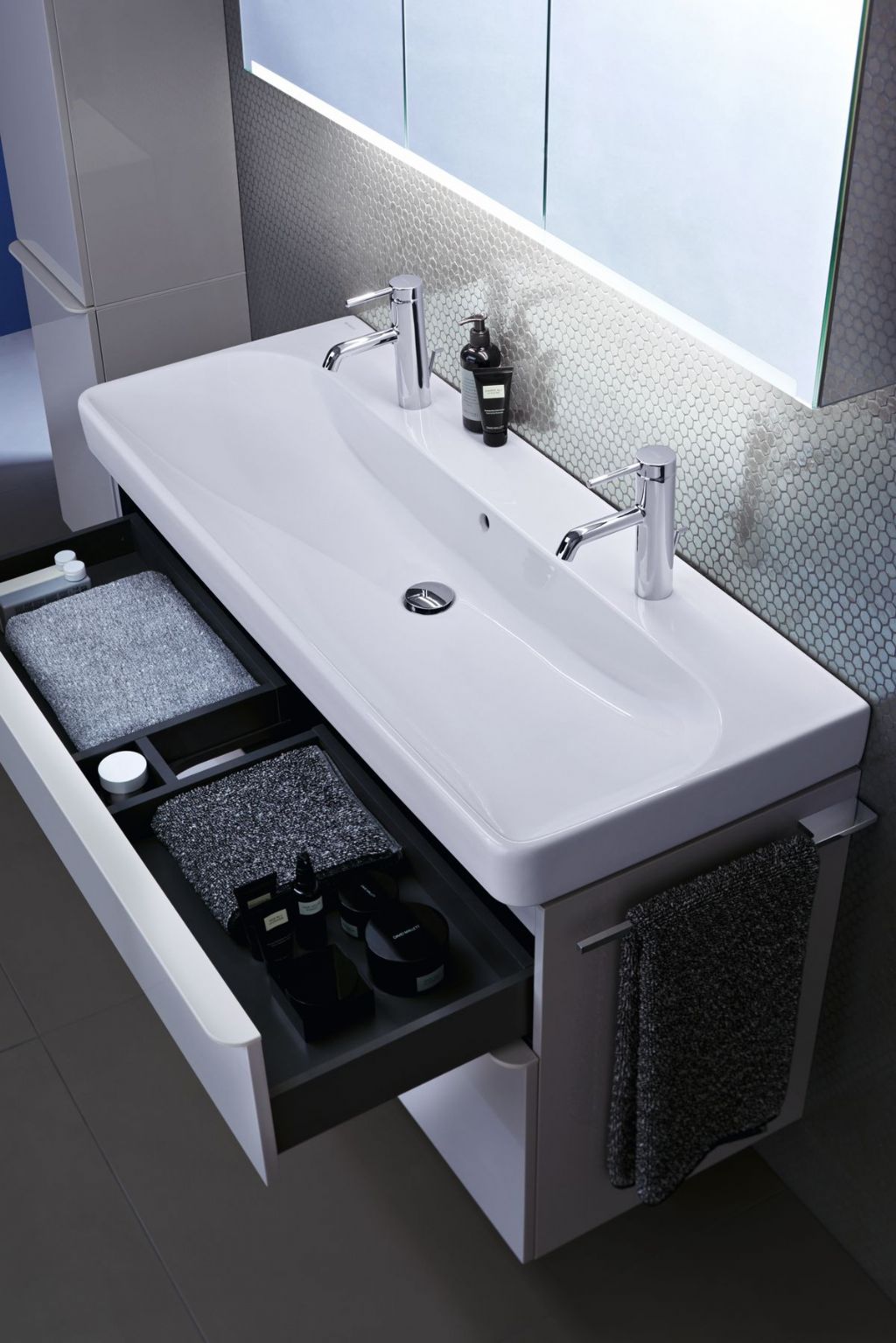 De sierlijke lijnen, harmonieuze vormen en smalle randen van de wastafels contrasteren met de functionele binnenkommen en de ruime aflegvlakken aan de achterkant van de wastafel. "De licht afgeronde randen van de handgrepen – die voor een naadloze overgang zorgen van de wastafel naar de kast – zijn nieuw," aldus Katrien Van Malderen, Product manager bij Geberit. "De handgrepen vormen één geheel met de smalle randen van de keramische sanitaire toestellen. Creatieve vrijheid was voor ons erg belangrijk, en dat hebben we mogelijk gemaakt door talloze combinatiemogelijkheden te bieden."