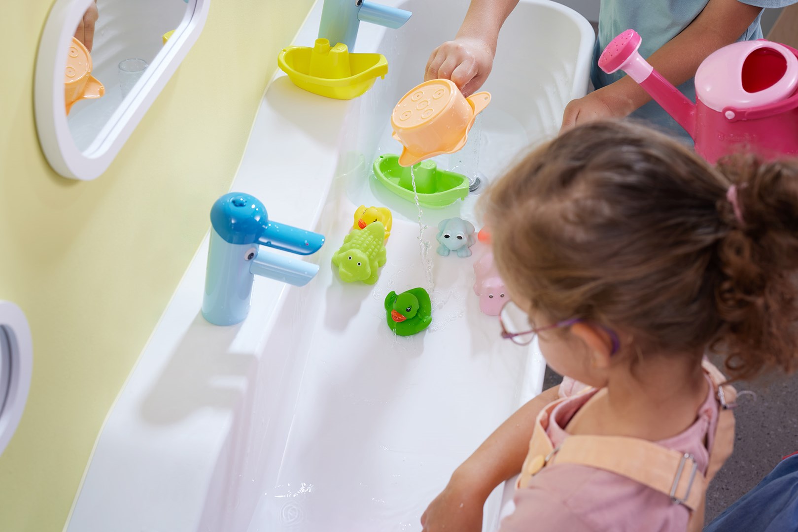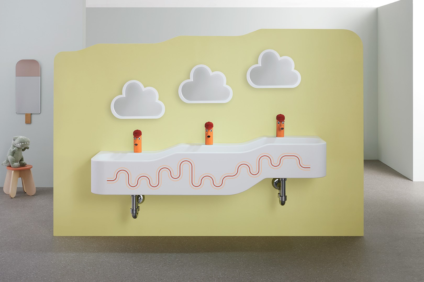 Het vernieuwde speel- en waslandschap van Geberit Bambini brengt een innovatief ontwerp samen met functionaliteit. Met tot drie niveaus in de wastafels, toegankelijk voor verschillende leeftijdsgroepen, creëert het landschap een leuke en interactieve omgeving. Deze zones, ontworpen als zachte golven, voegen een speels element toe dat kinderen uitnodigt om meer te leren over persoonlijke hygiëne op een leuke manier.