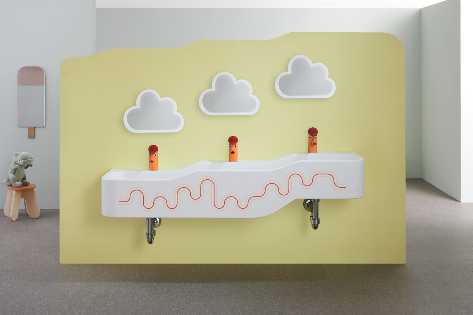 Het vernieuwde Geberit Bambini speel-en waslandschap heeft een modern en tijdloos design. In de wastafelzijn tot drie niveaus geïntegreerd, die elk geschikt en toegankelijk zijn voor verschillende leeftijdsgroepen. Deze niveaus zijn afgebeeld als zachte golven die het ontwerp een speels en vloeiend effect geven. We spreken van een speel-en waslandschap omdat de serie zorgt voor een leuke omgeving met waterglijbaan, ludieke elementen en tactiele zones.