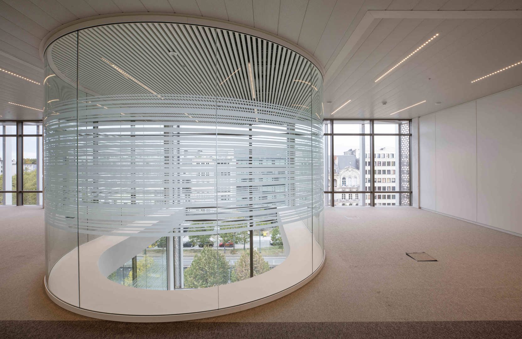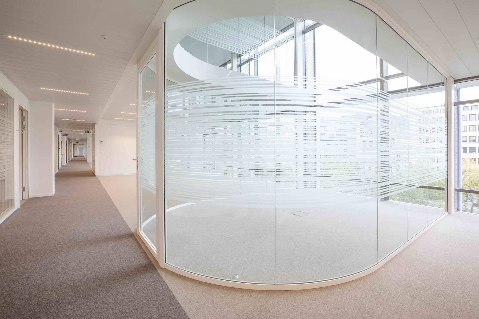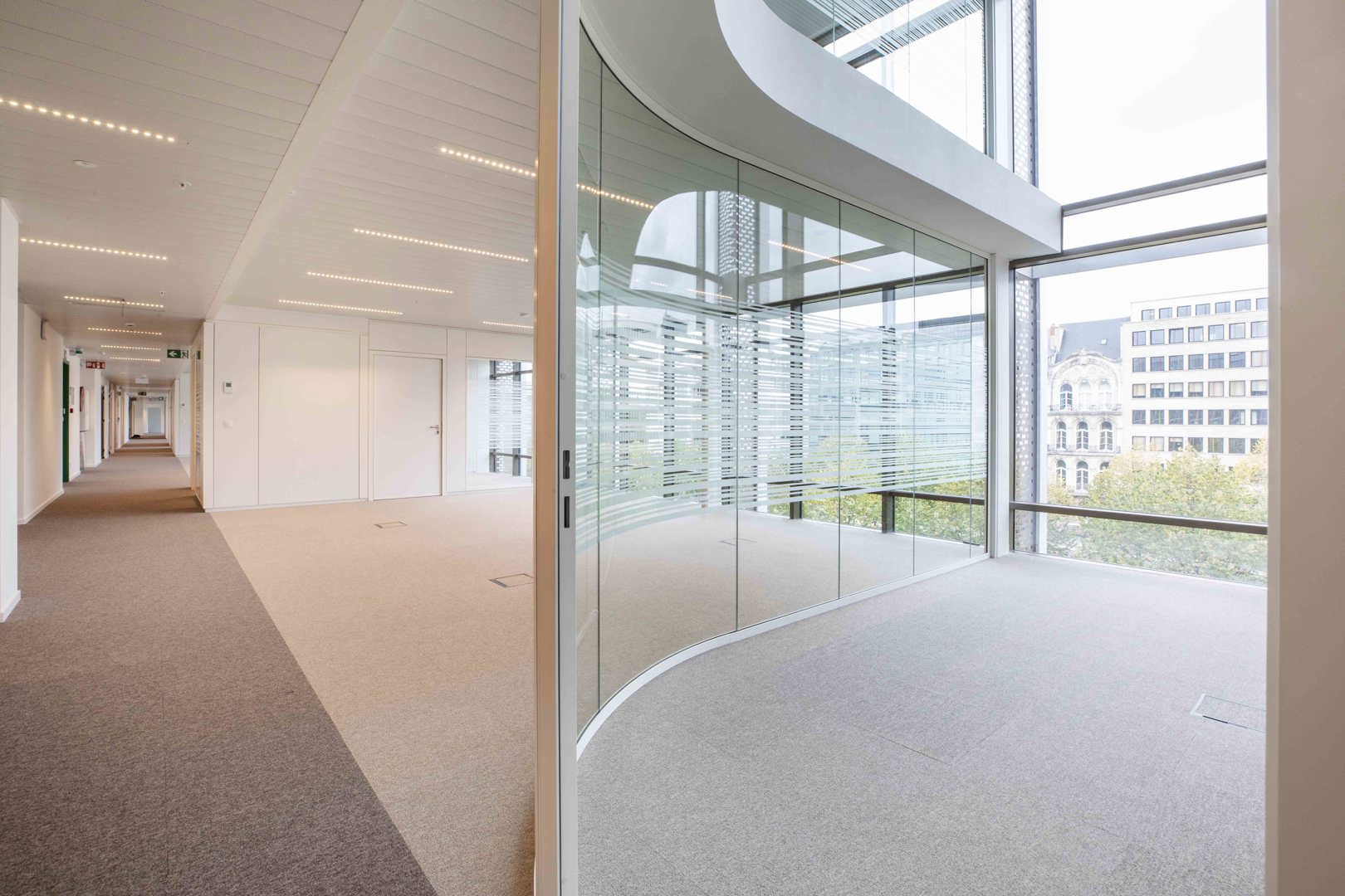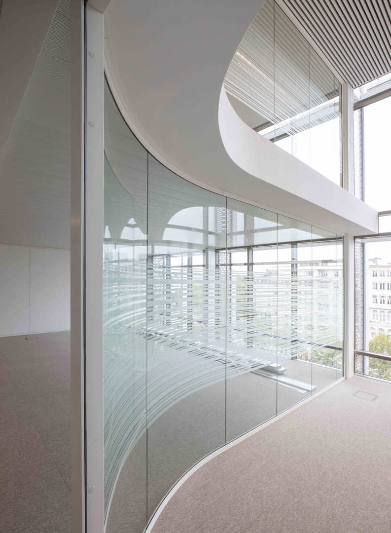 Voor de interne afwerking leverde Beddeleem de gebogen JB 4000 enkelbeglaasde wanden. Deze maatoplossing vereiste intensieve R&D, engineering en productie-expertise. De gebogen glaswanden sluiten naadloos aan bij de architecturale visie van het ontwerpteam en illustreren hoe flexibele wandsystemen complexe vormen en hoge esthetische eisen kunnen ondersteunen.