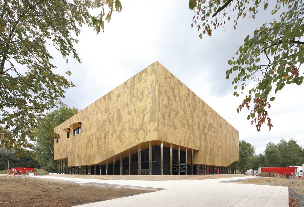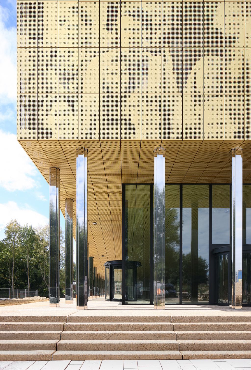 De gevel van het gelijkvloers is 1 module naar binnen geplaatst waardoor een overdekte rondgang ontstaat. Het zwevende volume erboven wordt omhuld door geperforeerde gouden aluminium platen. Deze platen vormen een vaste zonwering voor de auditoria, microscopie- en practicumzalen en zorgen voor zacht gefilterd licht en een buitenzicht. De panelen kunnen op de 3de verdieping geopend worden om in de praktijklokalen een maximale lichtinval te hebben. Door zowel de gevel als het plafond van de rondgang en de foyers uit te voeren in het zelfde materiaal ontstaat er een coherent zwevend volume dat ’s avonds door strooilicht een spoor van gebruik laat zien aan zijn omgeving.