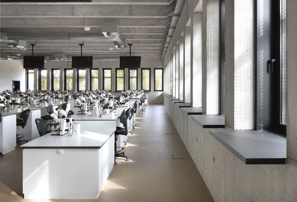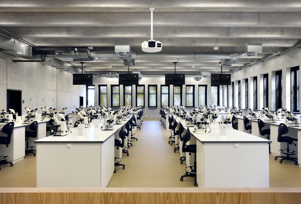 De bovenste verdieping (+3) is gereserveerd voor de practicum- en microscopiezalen.