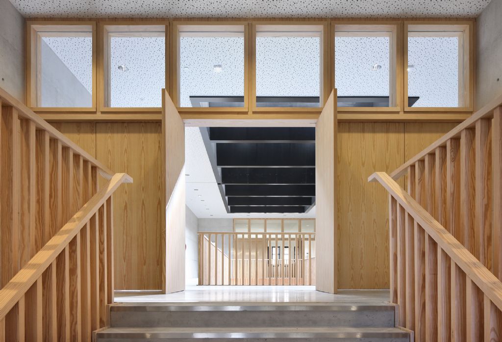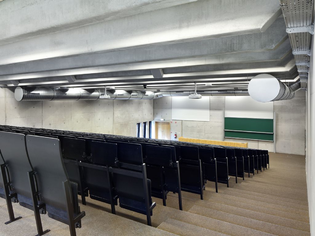 Op niveau -1 en niveau +1 worden telkens 4 auditoria georganiseerd rond het centraal atrium met grote lichtstraat die het zenitale daglicht laat afdalen tot de ondergrondse verdieping. De begane grond is voor gemeenschappelijke functies en voor ruime inkom- annex ontmoetingsruimtes. Van hieruit vertrekken 4 compacte trappenhuizen die zorgen voor korte circulatielijnen en snelle brandevacuatietijden.