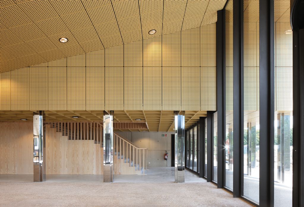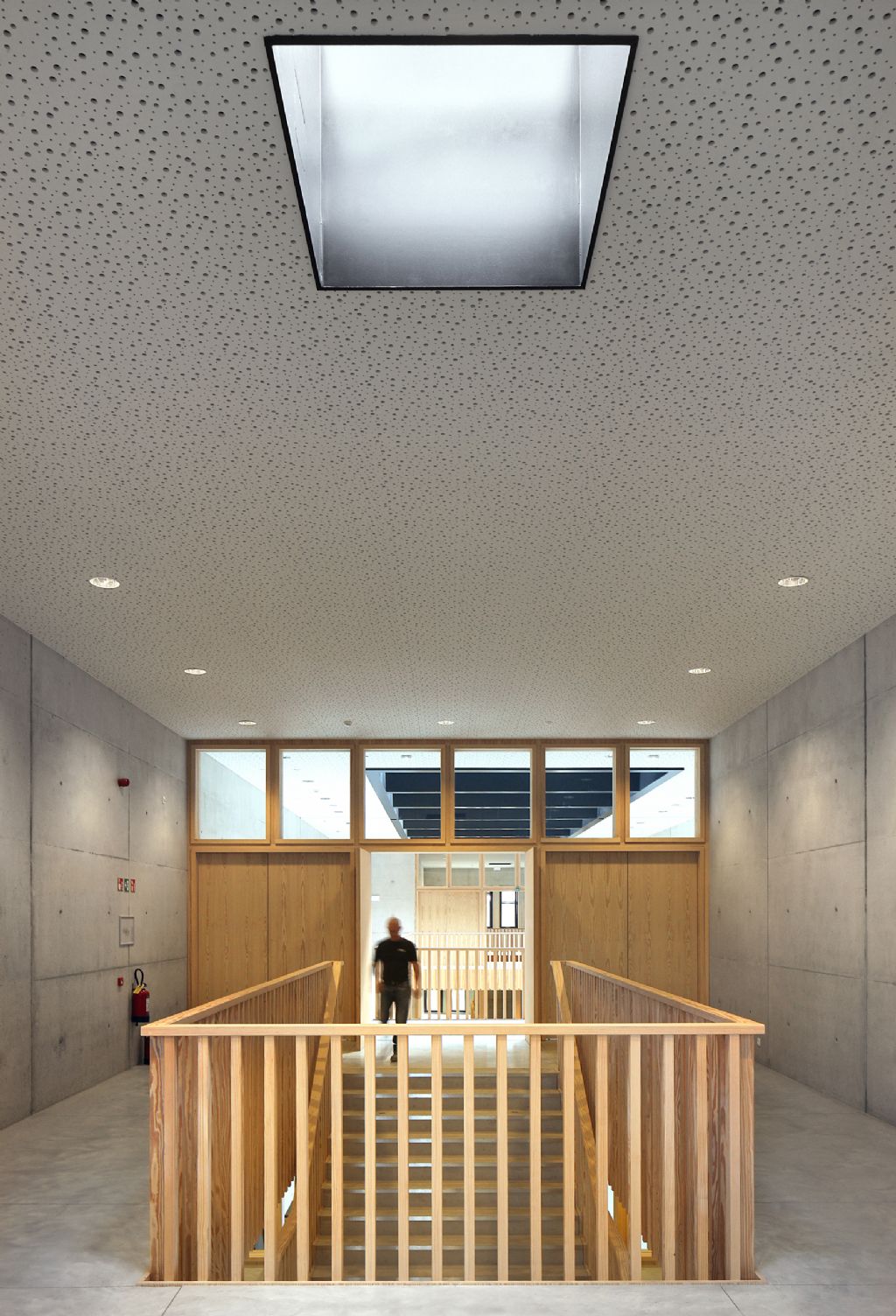 Ook hier hanteerde META het ‘ruwbouw is afbouw’ principe. Door extra aandacht te besteden aan de ruwbouw kunnen diverse afwerkingslagen weggelaten worden. Dat resulteert in een solide, student-resistente constructie. Het interieur werd verder afgewerkt met yellow pine multiplex, naaldvilttapijt en hoogglans gepolijste inox. Bij het betreden van het gebouw wordt een geleidelijke overgang gemaakt in de hardheid en ruwheid van de materialen.