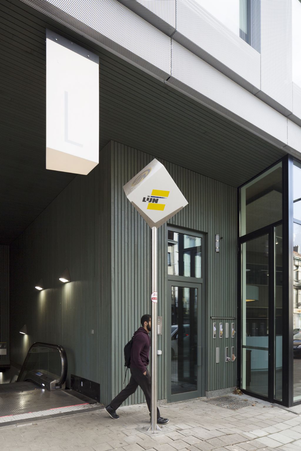 Door het overhangende gebouw is de metrofunctie goed zichtbaar en beschut het ook voetgangers. Voor het eerst wordt de ondergrondse metro-infrastructuur in Antwerpen zo bovengronds zichtbaar gemaakt. Daarbij is er ook voorzien in op maat ontworpen signalisatie en verlichting en een opening in de vloerplaat van de begane grond met doorzicht naar de ondergrondse trappenpartijen.