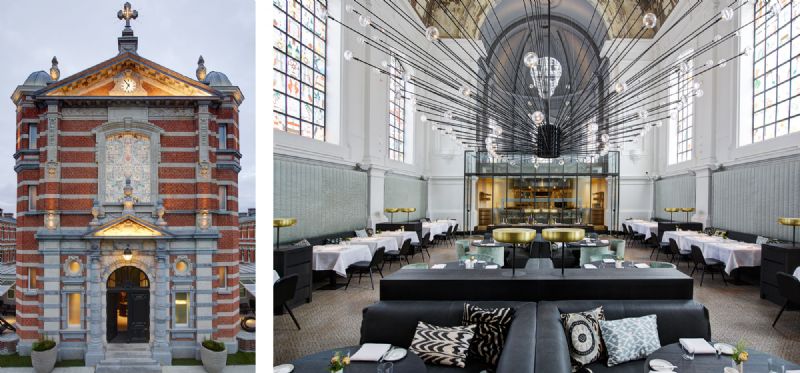 De kapel van het voormalige militaire hospitaal in Berchem. Niet veel mensen zouden zich eraan wagen om op zo'n verrassende locatie een luxueuze eettempel te beginnen. Bij The Jane loopt het adagium 'food is our religion' nochtans als een rode draad door het ontwerp. Zo werd het altaar omgetoverd tot een open keuken en waar vroeger het orgel stond, weerklinkt nu een heel soort ander muziek, tijdens de maandelijkse Night Sessions in de Upper Room Bar. Het inventieve concept werd uitgedokterd door designstudio Piet Boon en architectenbureau VRV Architecten. Rienk Wiersma, designer bij Piet Boon, vertelt: “We zijn in een vroeg stadium bij het ontwerp betrokken. Door de vriendschappelijke relatie met Sergio hadden we alle vertrouwen en gaven ze ons carte blanche. Als thema kozen we voor 'fine dining meets rock 'n roll'.” Van dat laatste getuigt onder meer de gigantische schedel die de ruimte oplicht. De architecten en designers startten vanaf een site die jarenlang ongemoeid is gebleven, en bij aanvang een vervallen karakter had. Vanuit het geloof in authenticiteit, functionaliteit en materialen die 'mooi oud worden', koos designstudio Piet Boon ervoor om slechts het hoognodige te restaureren in de kapel en het overige decor te conserveren. Zo bleef het plafond van het vroegere godshuis intact.