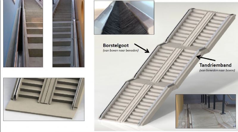 Met de VeloComfort kan je volgens hetzelfde principe ook een fiets omhoog duwen op een trap. Beter nog, dankzij een smalle lopende band in het gootje die aanschakelt zoals een roltrap, zal je geen druppel zweet plengen. (filmpje)