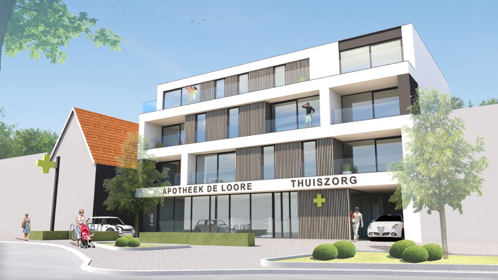 Met apotheek De Loore in Wingene ontwierp architectenburo Berkein een totaalconcept: de handelsfunctie wordt gecombineerd met een meergezinswoning op de verdiepingen daarboven.
