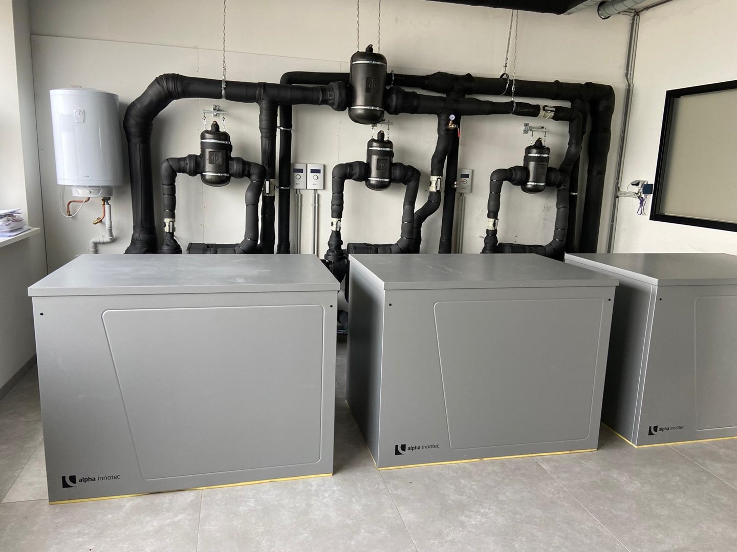 Daniëls: “Voor de kantoren bepaalden we een constante temperatuur van 22° C, zowel in de winter als de zomer. De werkplaats wordt in de winter verwarmd tot 16 ° C – voldoende voor de dagelijkse activiteiten waarin poorten regelmatig open en dicht gaan. In de zomer wordt de werkplaats net zoals de kantoren gekoeld tot 22° C.” Intellisol koos voor een geothermisch systeem met drie warmtepompen van Alpha innotec, goed voor een totaal afgiftevermogen van 112 kilowatt. "Deze warmtepompen hebben een indrukwekkende COP van 4,8, maar in de praktijk presteren ze zelfs nog beter," vertelt Daniëls. "De installatie bestond uit 10 geothermische boringen tot 130 meter diepte, goed voor een vermogen van 110 kilowatt."