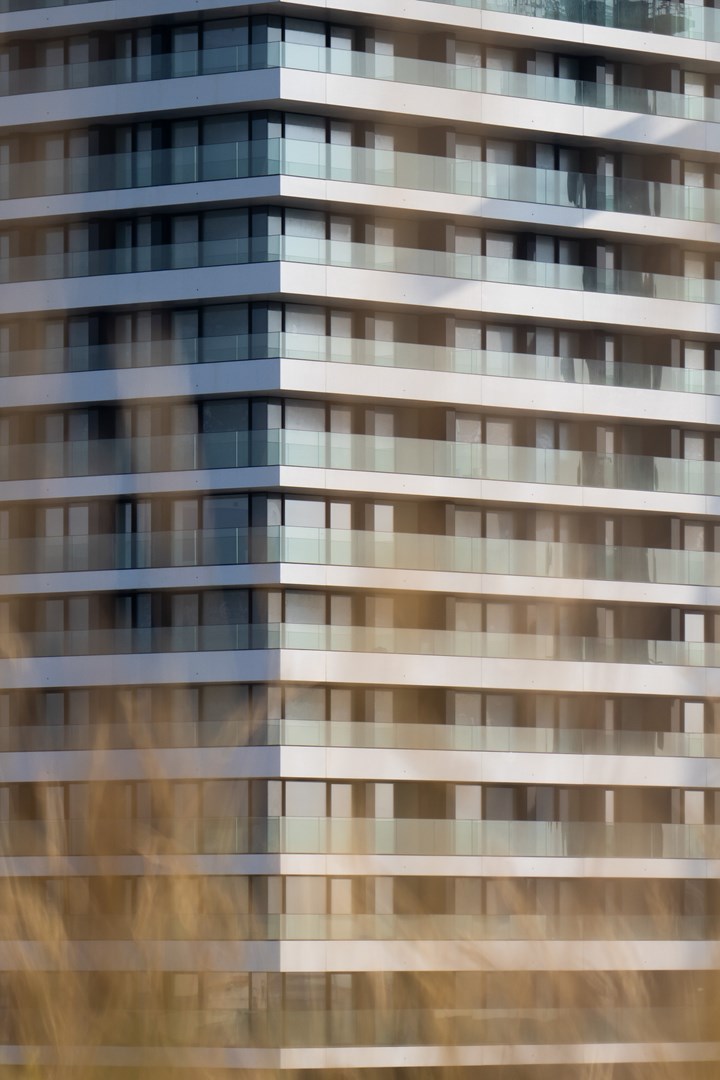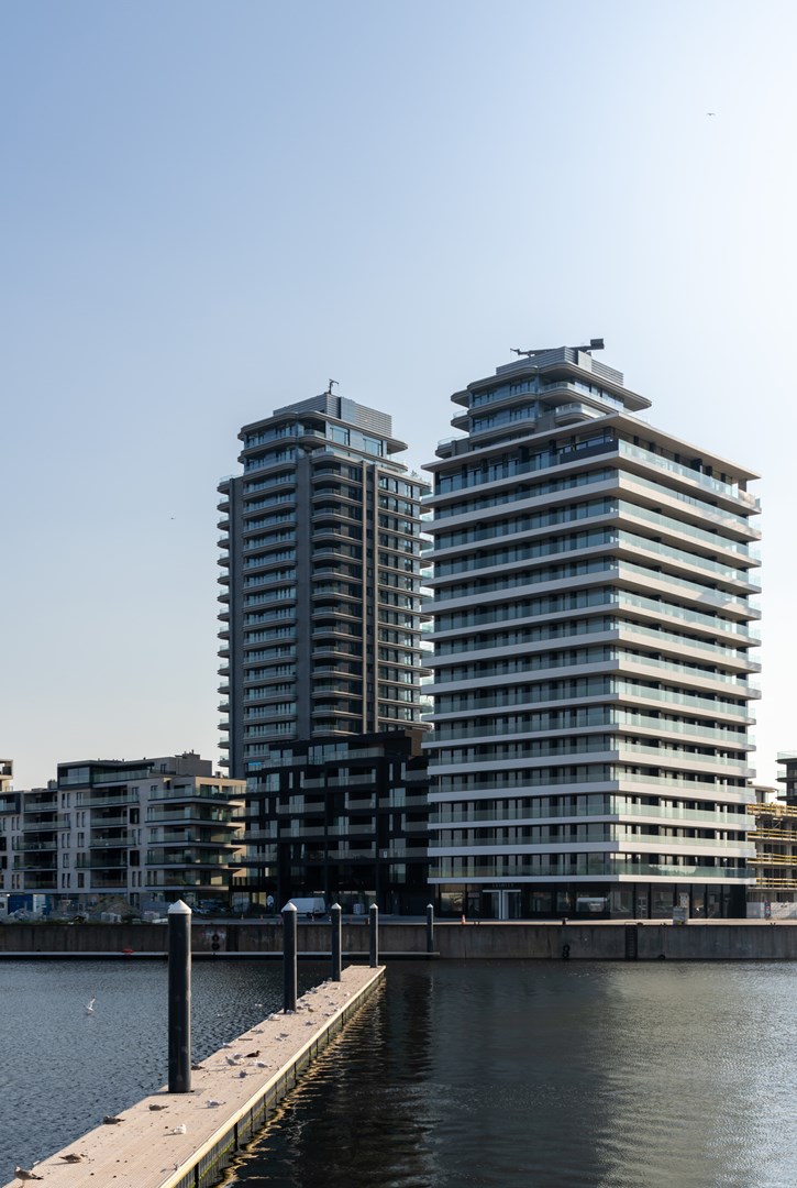 Deze architecturale javanais wordt versterkt door bijzondere spiegelwanden als scheiding tussen de appartementen, die niet alleen privacy creëren maar ook een dynamisch spel van licht en perspectief in de omgeving introduceren. Deze ‘kieuwen’ tillen de esthetiek van het gebouw op en zorgen voor een tijdloze en lichte uitstraling die de skyline van Oosteroever verrijkt.