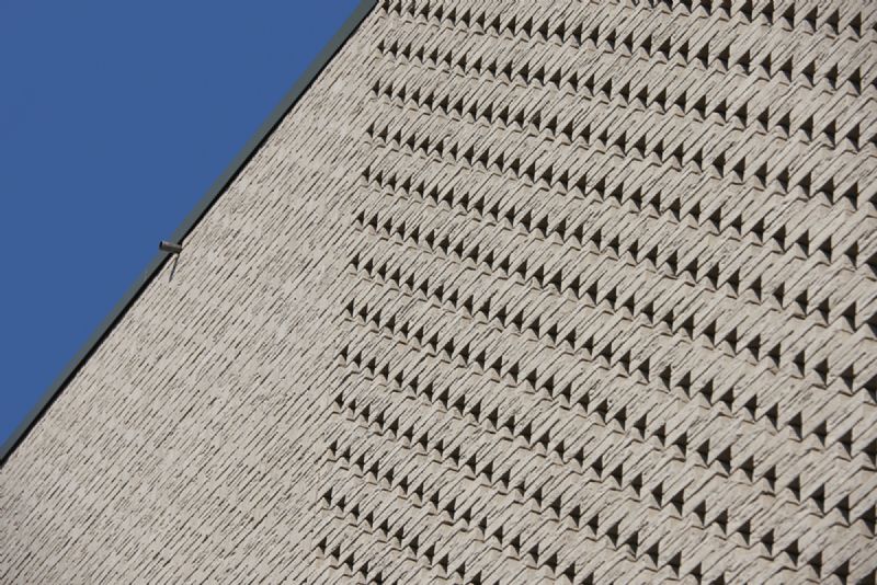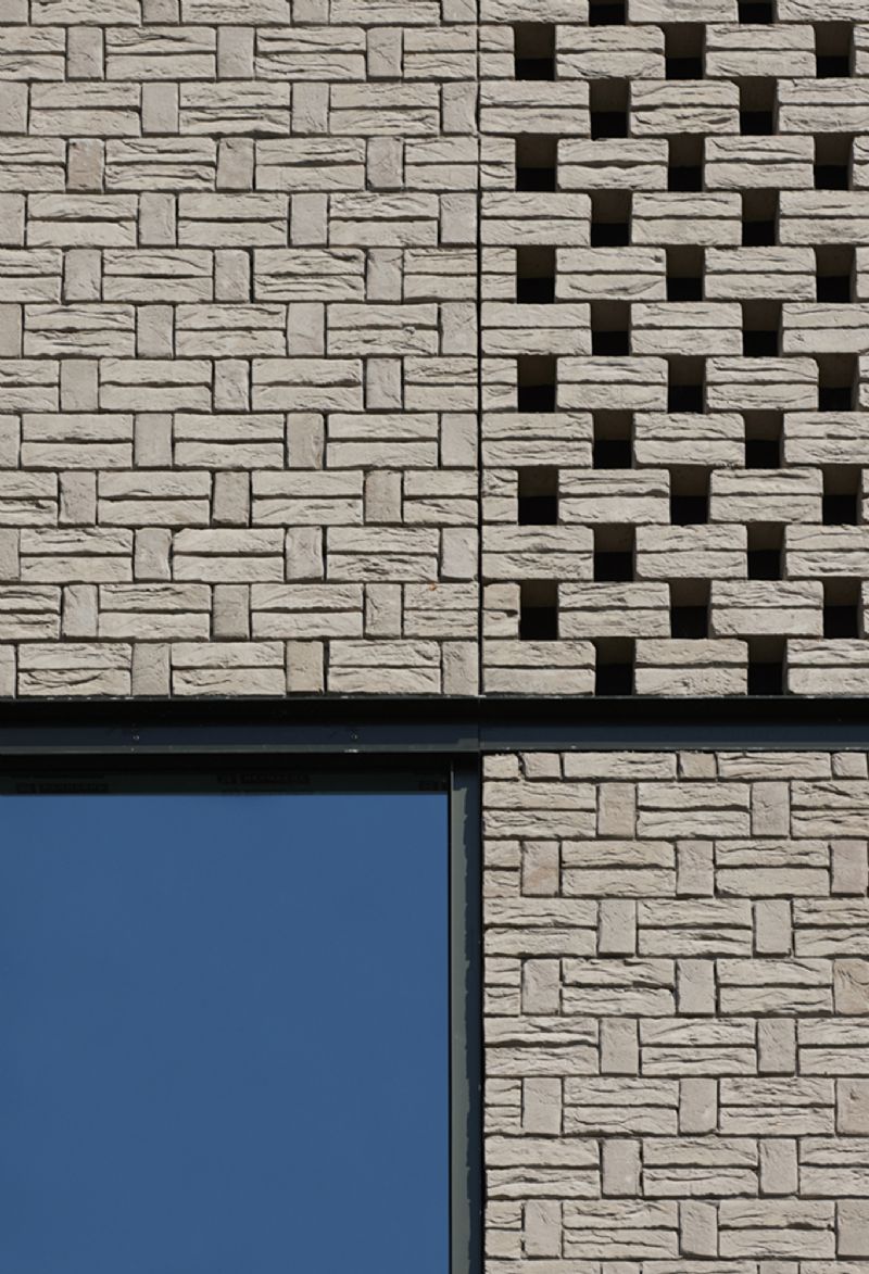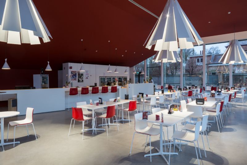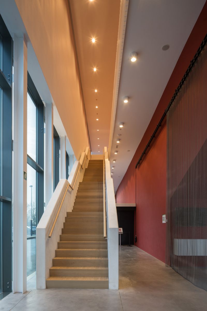 Abscis: “Het programma vroeg een theaterzaal met een vaste tribune voor 400 personen en bijbehorende functies. Kantoorruimte voor de diensten cultuur en sport en een tentoonstellingsruimte. De verschillende functies van het gemeenschapscentrum zijn op logische wijze geordend langs een zichtbaar circulatiepatroon.” De gangen en trappen betrok Abscis op de buitenruimte, die zorgen voor een aaneengeschakelde ruimtelijke ervaring binnen het gebouw. Dat vormt op zijn beurt voor een tentoostellingsparcours. De foyer kijkt uit op het zandbergplein via een opvallend raam in de voorgevel.