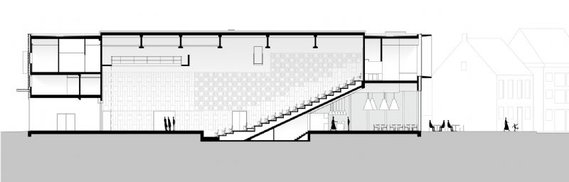 De theaterzaal ligt met zijn rug naar het zandbergplein toe. De foyer bevindt zich onder het hoge gedeelte van de tribune en vloeit over naar de publieke ruimte op het Zangbergplein. In de vrijstaande volumes onder de uitkragende tribune bevinden zich een bar, de ticketbox, vestiaire, EHBO en toiletten. De verdieping is bereikbaar via een luie trap vanuit de foyer of met de lift. Hier bevinden zich de administratieve functies die uitkijken op de parking.