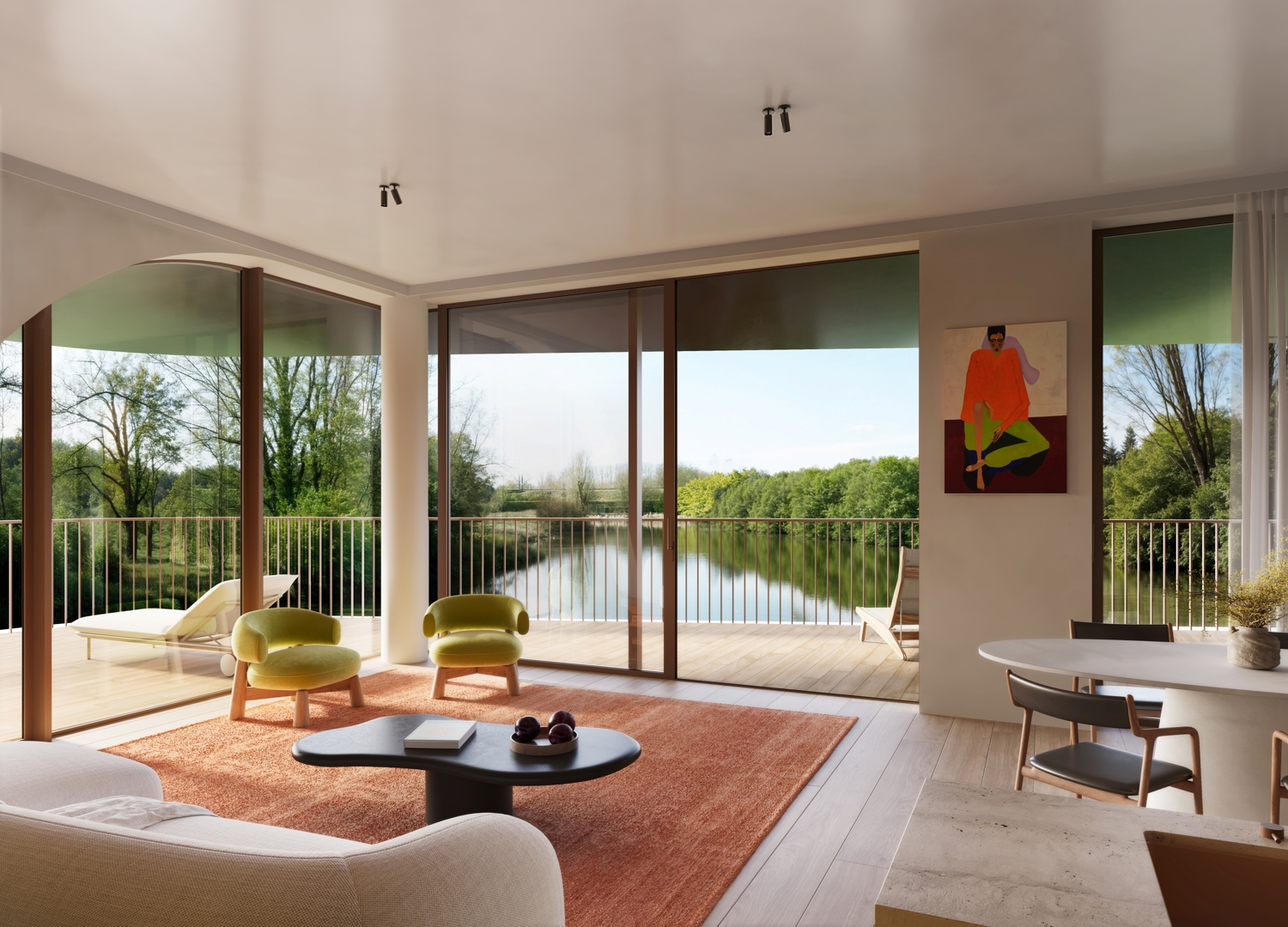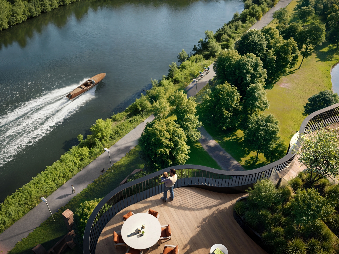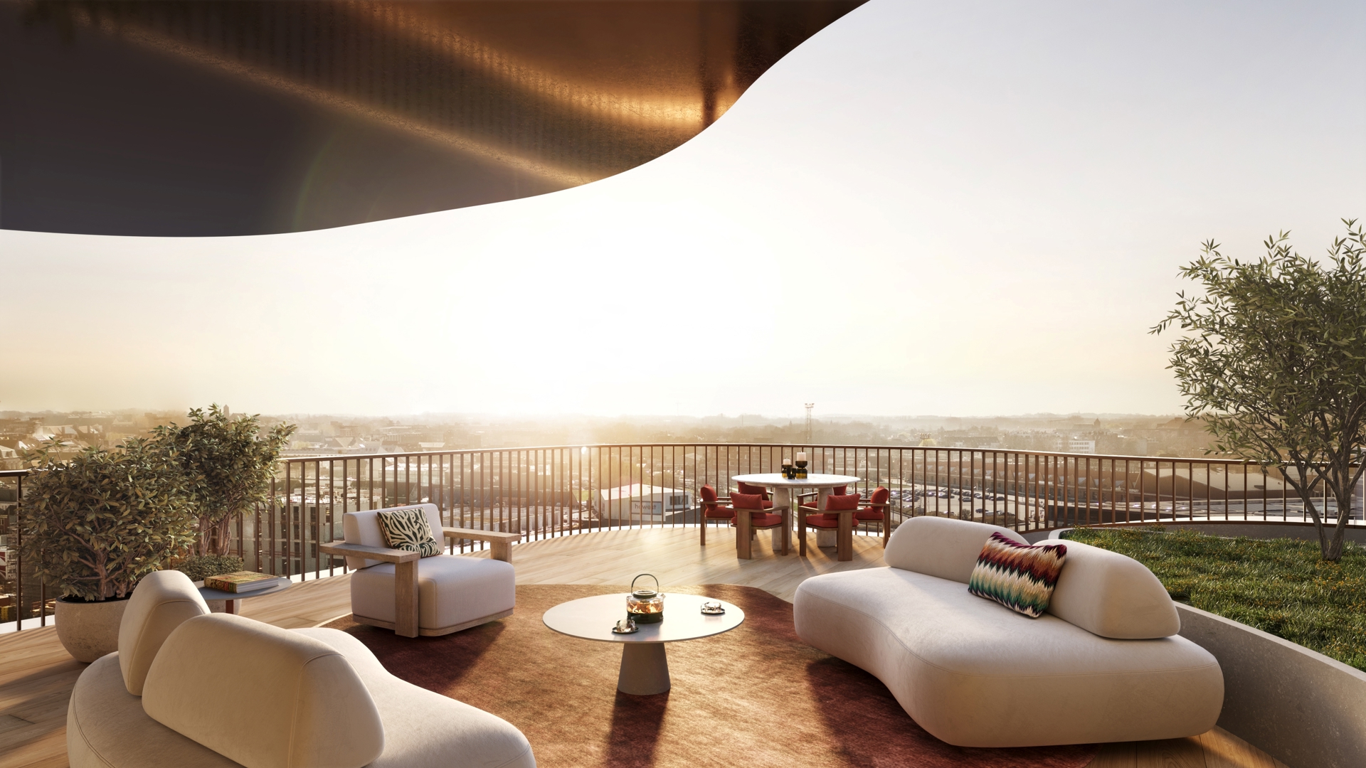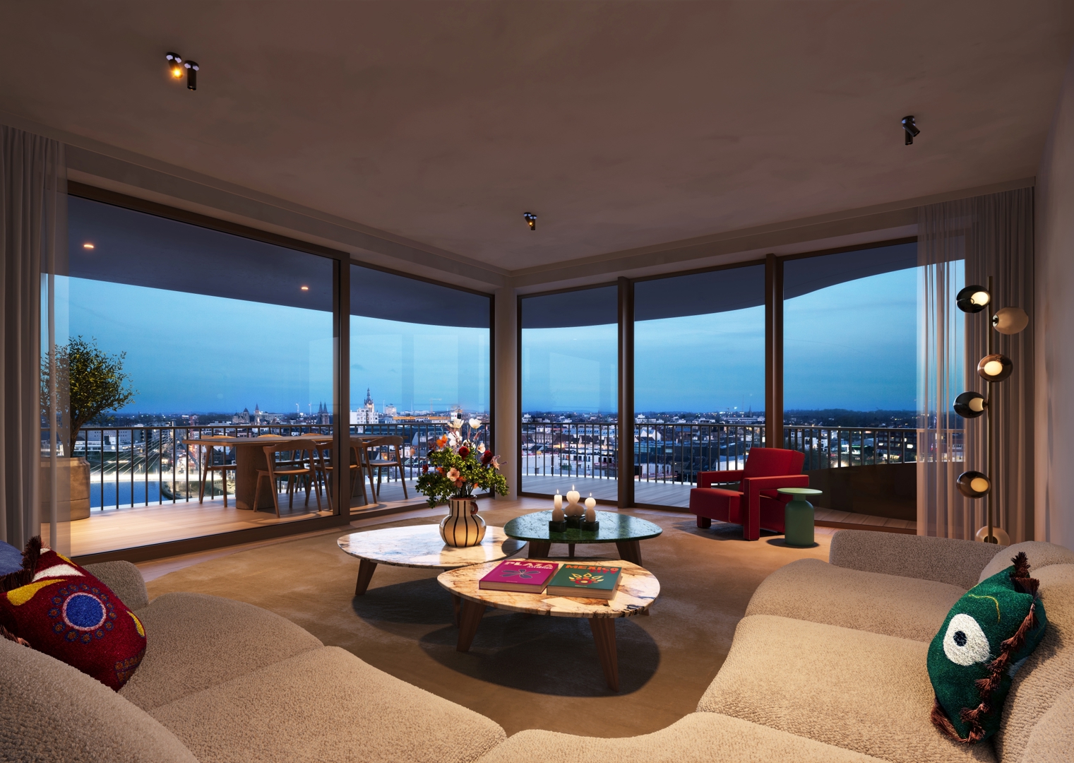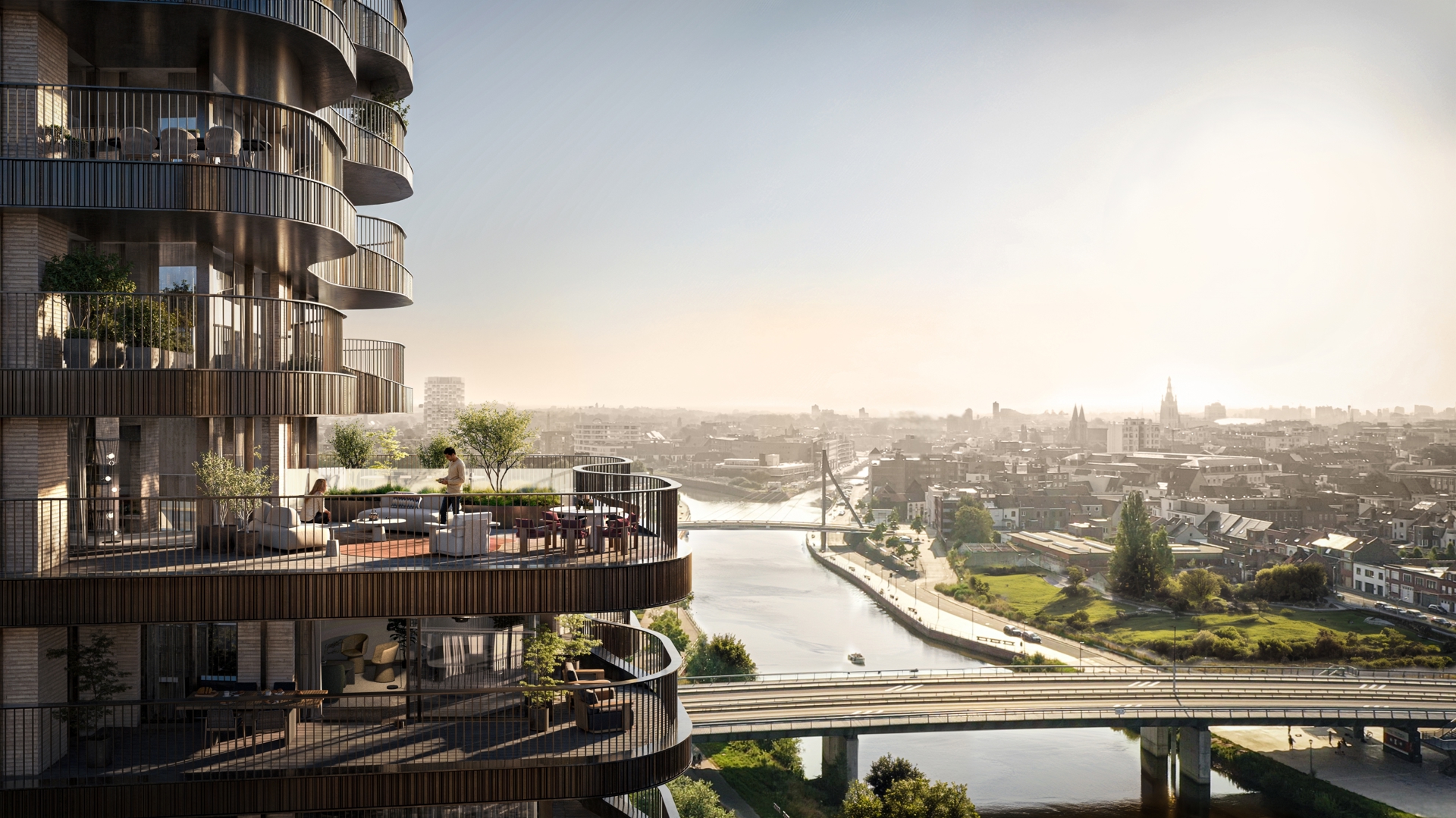 ARCAS ontwierp de twee torens met expressieve, golvende balkons in donkerbrons aluminium en een verfijnd lijnenspel. “We wilden een landmark dat zich niet afzet tegen de omgeving, maar er net deel van uitmaakt,” zegt architect Lukas Chielens. De architectuur is harmonieus en sober, met een sterke focus op transparantie: grote raampartijen en ruime terrassen zorgen voor een constante dialoog tussen binnen en buiten. Niet alleen het zicht op de stad en de rivier is spectaculair, ook de connectie met het leven rondom wordt zo versterkt.