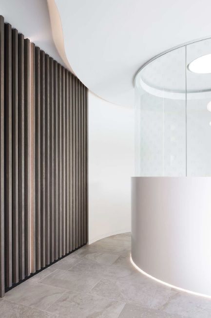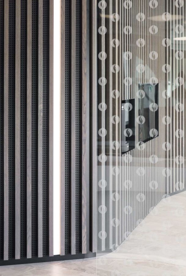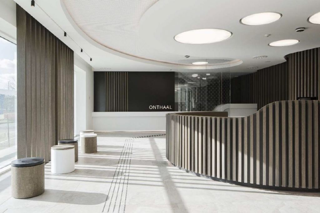 Door hout en natuurlijke materialen te gebruiken straalt de inkom een aangename sfeer uit. De balie en het digitaal loket werden uitgevoerd in solid surface omwille van de vloeiende lijnen, de onderhoudsvriendelijkheid en stootvastheid van het materiaal.
