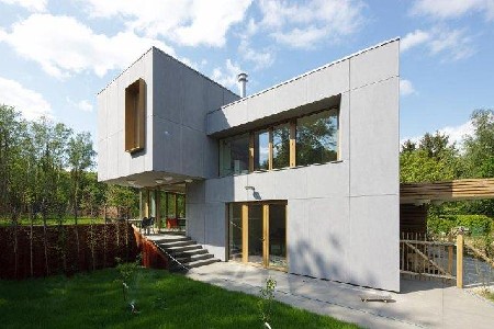 Het volume van 10m breed, 12m lang en 8 m hoog (waarvan 2m ondergronds), telt 5 splitlevels van verschillende hoogtes, gaande van minder dan twee meter voor bergruimte tot meer dan 4 meter voor de zitruimte. De buitenkant is bekleed met FSC gelabeld hardhout, en toont zich als een “bolster”, met een ritmisch patroon van haaks uitstekende gevelplanken die door hun schaduwwerking de compactheid van het volume benadrukken.