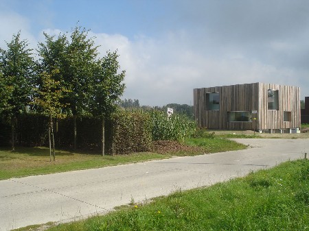 Deze passiefwoning is gebouwd op een hoekperceel aan de rand van een verkaveling. Het perceel is omgeven door een straat aan de zuidzijde, een dienstweg aan de westzijde, een landbouwzone aan de noordzijde, en een aanpalend bouwperceel aan de oostzijde. Door het ruimtegebruik en de terreinbezetting levert dit typisch Vlaamse verkavelingslandschap een eerder zwakke context op die even generiek als specifiek is, en die even zeer te bestempelen valt als nontext. De woning stelt zich in deze setting op als een schijnbaar onverschillige doos, die de logica van voor- en achtergevel in vraag stelt en de omgeving aan iedere zijde op een gelijkaardige manier aanspreekt. De middelen die hiervoor in het ontwerp werden ingezet zijn hoofdzakelijk de schil en de binnengevels van de woning.