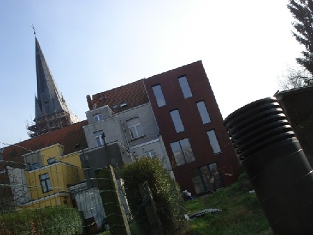 De traditionele stedenbouwkundige voorschriften vormden er zowat de absolute tegenpool van het gedachtegoed ‘compact bouwen’. Het naastgelegen gebouw illustreert aan de tuinzijde waar een letterlijke navolging van die voorschriften toe leidt: een verminderde bouwdiepte per verdieping. Dergelijke bouwwijze resulteert niet alleen in een banale architectuur, maar is bovendien duur en energie-inefficiënt.