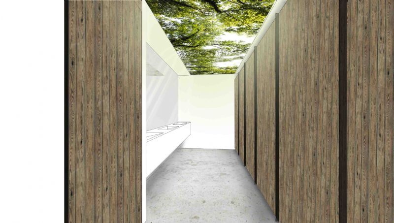 Bij de renovatie werden er vijf toiletpaviljoenen onder handen genomen. Belangrijk was om het groene en bosrijke karakter van het domein in de sanitaire ruimtes te integreren. Omdat een boom in een toiletruimte niet meteen de meest hygiënische keuze is, werd er geopteerd voor het tweede meest natuurlijke idee.