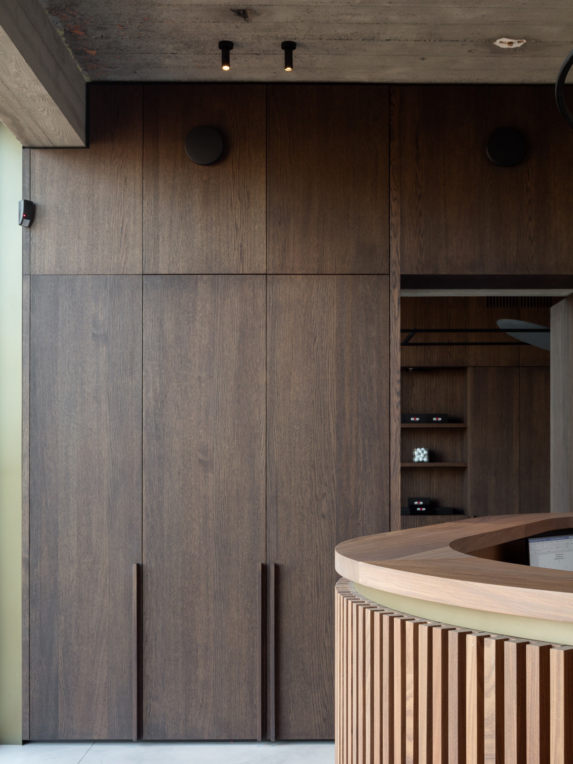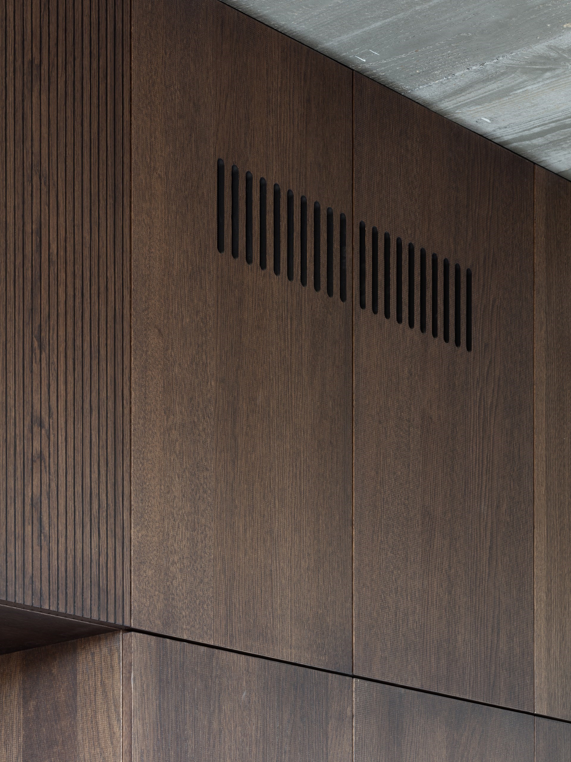Uiteindelijk deed het team een beroep op de expertise van Print Acoustics by Triplaco om het concept mee te helpen bepalen. Uit de vele akoestische oplossingen Triplaco kozen architect en bouwheer voor integratie van gegroefde panelentype Db en panelen met Microperforaties type M in het ganse interieur. Speciaal voor dit project werden alle panelen in fineer Europees Eiken Decospan uitgevoerd en geolied met een warme wengé kleur.