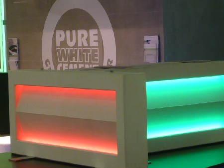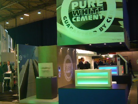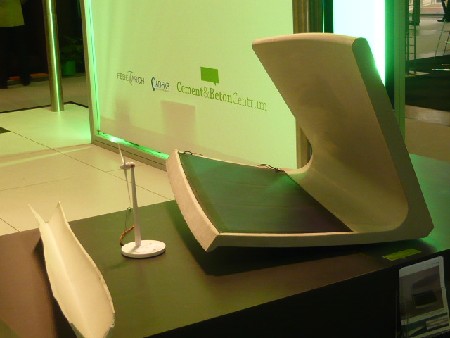 Bijzonder interessant was de stand van het Cement & Beton Centrum. Hier kregen we prototypes te zien van allerhande nieuwe betontoepassingen waarvoor een producent en een ontwerper de koppen bij elkaar gestoken hadden. Dit kaderde in het programma De Energieke Gevel waaraan ook Febelarch en enkele Belgische fabrikanten hebben meegewerkt waaronder Decomo, Prefadim en Arbeco. Deze laatste firma had samen met het Nederlandse architectenbureau Van Wylick het PVLT-beton ontwikkeld.