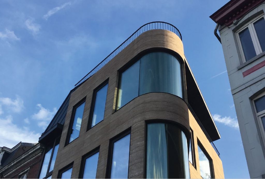 De Zwitserse architect Peter Zumthor luidde midden jaren 2000 een revival van het materiaal in met de bouw van de ‘Bruder Klaus Feldkapelle’ in de Duitse Eifel. DMOA was geprikkeld door de techniek en pikte die eerder al op voor het project ‘Farmer's house’. Ook voor het eigen kantoor bood het stampbeton de gewenste uitstraling en duurzaamheid. “We hebben uitvoerig geëxperimenteerd om een optimale samenstelling te vinden voor een korrelig, zacht-bruin stampbeton dat slechts 10 cm dik mocht zijn. De droge beton werd in dunne lagen in een glijbekisting aangebracht en handmatig aangedamd. Hierbij stak het hele DMOA team de handen uit de mouwen. De mooie kleur is puur natuur en vervaardigd met zand uit een Lubbeekse groeve. We hebben er een hoop chocolade-bruin zand besteld. De andere bestanddelen verzachtten de kleur tot een zonnig lichtbruin. We hebben dus geen pigmenten toegevoegd die met de tijd vervagen, gewoon de natuurlijke kleur van het mengsel,” legt Benjamin Denef uit.