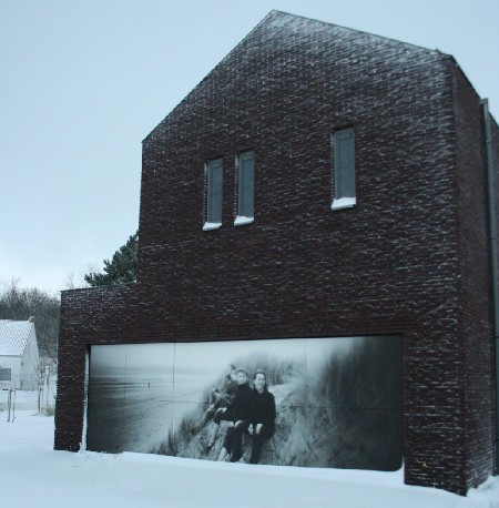 De architect tekende een open bebouwing met onderin een garage en fietsenberging, gescheiden door een vast geveldeel. De poorten tot deze voorzieningen zouden het gevelbeeld echter sterk opdelen, en dat was niet gewenst. Dan kwam het idee om de foto die voorbestemd was voor de living in te schakelen om de toegangen tot de woning te camoufleren. De MEG Digital Print platen van Abet Laminati zouden dat mogelijk maken. Het nodige inpaswerk op de tekentafel bracht aan het licht dat het beeld te sterk versneden werd door de openingen in de gevel. Pat Heylen twijfelde niet lang: er moet een nieuwe foto worden gemaakt!