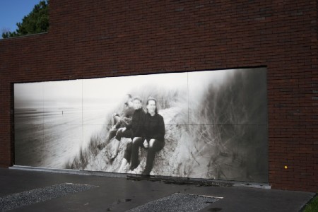 Het beeld werd nauwkeurig in scène gezet om de nadien gewenste plaatsing op de gevel te kunnen realiseren. “Het idee om die foto te gebruiken heeft heel wat gevolgen gehad” blikt Pat Heylen terug. “Zo konden we voor de garage geen sectionaalpoort kiezen. Bovendien verplichtte de verschillende dikte van de poorten ons ertoe de foto ook op MEG Digital Print platen met verschillende dikte uit te werken: 6 mm voor de garage en 8 mm voor de fietsenberging”.